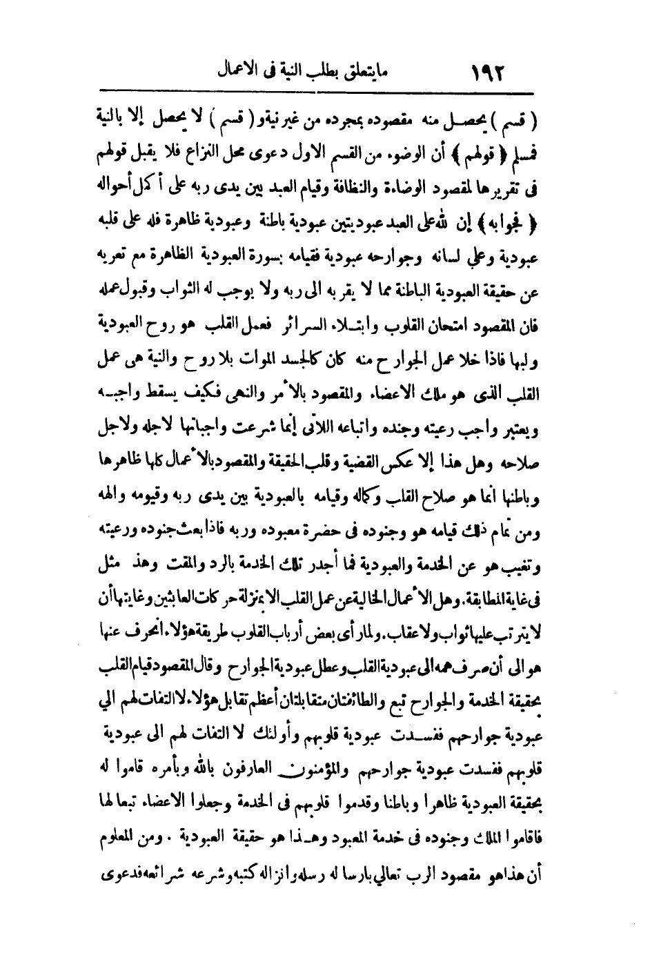 والنية هي عمل القلب الذي هو ملك الأعضاء والمقصود بالأمر والنهي فكيف يسقط واجبة ويعتبر واجب رعيته وجنده واتباعه اللاتي إنما شرعت واجباتها لأجله ولأجل صلاحه، وهل هذا إلا عكس القضية وقلب الحقيقة والمقصود بالأعمال كلها ظاهرها وباطنها إنما هو صلاح القلب وكماله وقيامه بالعبودية بين يدي ربه وقيومه وإلهه ومن تمام ذلك قيامه هو وجنوده في حضرة معبوده وربه فإذا بعث جنوده ورعيته وتغيب هو عن الخدمة والعبودية فما أجدر تلك الخدمة بالرد والمقت وهذا مثل في غاية المطابقة. وهل الأعمال الخالية عن عمل القلب إلا بمنزلة حركات العابثين وغايتها أن لا يترتب عليها ثواب ولا عقاب.