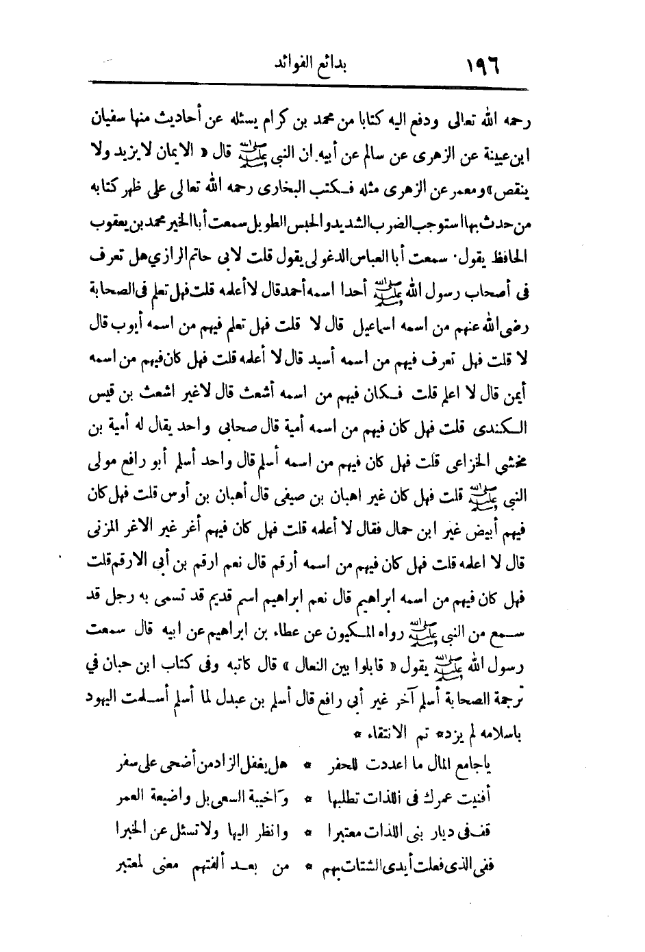 رحمه الله تعالى ودفع إليه كتابا من محمد ابن كرام يسأله عن أحاديث منها سفيان بن عيينة عن الزهري عن سالم عن عن أبيه أن النبي صلى الله عليه وسلم قال: "الإيمان لا يزيد ولا ينقص " ومعمر عن الزهري مثله فكتب البخاري رحمه الله تعالى على ظهر كتابه: "من حدث بها استوجب الضرب الشديد والحبس الطويل سمعت أبا الخير محمد بن يعقوب الحافظ يقول: سمعت أبا العباس الدغولي يقول: قلت لأبي حاتم الرازي: هل تعرف في أصحاب رسول الله صلى الله عليه وسلم اسمه أحمد؟ قال: لا أعلمه، قلت: فهل تعلم في الصحابة رضي الله عنهم من اسمه إسماعيل؟ قال: لا غير الأغر المزني أسيد، قال: لا أعلمه، قلت: فهل كان فيهم من اسمه أيمن؟ قال: لا أعلم. قلت: أفكان فيهم من اسمه أشعث؟ قال: لا غير أشعت بن قيس الكندي، قلت: فهل كان فيهم من اسمه أمية؟ قال: صحابي واحد يقال له أمية بن مخشي الخزاعي، قلت: فهل كان فيهم من اسمه أسلم؟ قال: واحد أسلم أبو رافع مولى النبي صلى الله عليه وسلم، فهل كان غير أهبان بن صيفي؟ قال: أهبان بن أوس، قلت: فهل كان فيهم أبيض غير ابن حمال؟ فقال: لا أعلمه، قلت: فهل كان فيهم أغر غير الأغر المزني؟ قال: لا أعلمه، قلت: فهل كان فيهم من اسمه أرقم؟ قال: نعم أرقم بن أبي الأرقم، قلت: فهل كان فيهم من اسمه إبراهيم؟ قال: نعم إبراهيم اسم قديم قد تسمى به رجل قد سمع من النبي صلى الله عليه وسلم المكيون عن عطاء بن إبراهيم عن أبيه قال سمعت رسول الله صلى الله عليه وسلم يقول: "قابلوا بين النعال".