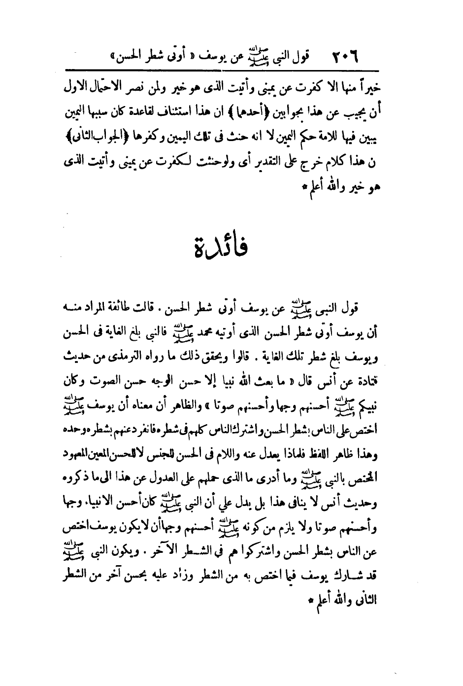 قول النبي صلى الله عليه وسلم عن يوسف "أوتى شطر الحسن " قالت طائفة المراد منه أن يوسف أوتي شطر الحسن الذي أوتيه محمد فالنبي صلى الله عليه وسلم بلغ الغاية في الحسن ويوسف بلغ شطر تلك الغاية قالوا ويحقق ذلك ما رواه الترمذي من حديث قتادة عن أنس قال: "ما بعث الله نبيا إلا حسن الوجه حسن الصوت وكان نبيكم أحسنهم وجها وأحسنهم صوتا".