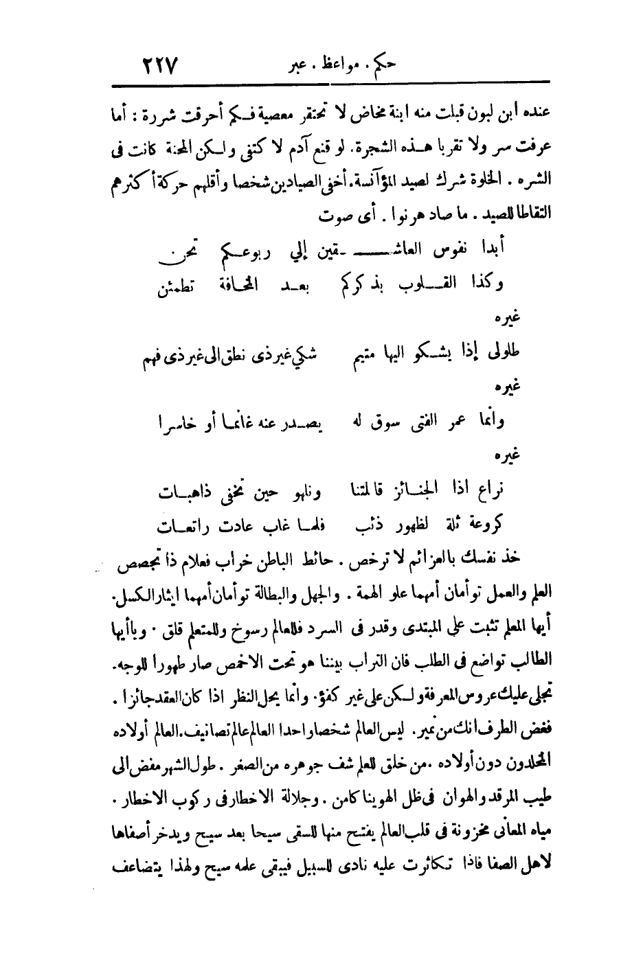 خذ نفسك بالعزائم لا ترخص. حائط الباطن خراب فعلام إذا تجصص. العلم والعمل توأمان أمهما علو الهمة. الجهل والبطالة توأمان أمهما إيثار الكسل. أيها المعلم تثبت على المبتدى وقدر في السر فللعالم رسوخ وللمتعلم قلق. ويا أيها الطالب تواضع في الطلب فإن التراب بيننا هو تحت الأخمص صار طهورا للوجه. تجلى عليك عروس المعرفة ولكن علي غير كفؤ. وإنما يحل النظر إذا كان العقد جائزا. فغض الطرف إنك من نمير. ليس العالم شخصا واحدا العالم عالم تصانيف. العالم أولاده المخلدون دون أولاده. من خلق للعلم شف جوهره من الصغر. طول الشهر مفض إلى طيب المرقد والهوان في ظل الهوينا كامن. وجلالة الأخطار في ركوب الأخطار. مياه المعاني مخزونة في قلب العالم يفتح منها للسقي سيحا بعد سيح ويدخر أصفاها لأهل الصفا فإذا تكاثرت عليه نادى للسبيل فيبقي علمه سيح ولهذا يتضاعف