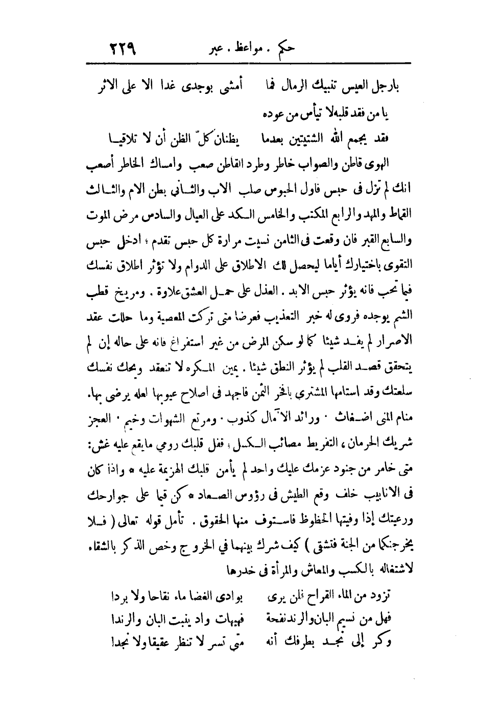الهوى قاطن والصواب خاطر وطرد القاطن صعب وإمساك الخاطر أصعب. إنك لم تزل في حبس فأول الحبوس صلب الأب والثاني بطن الأم والثالث القماط والمهد والرابع المكتب والخامس الكد على العيال والسادس مرض الموت والسابع القبر فإن وقعت في الثامن نسيت مرارة كل حبس تقدم. ادخل حبس التقوى باختيارك أياما ليحصل لك الإطلاق على الدوام ولا تؤثر إطلاق نفسك فيما تحب فإنه يؤثر حبس الأبد. العذل على حمل العشق علاوة ومريخ قطب الشم يوجده فروى له خبر التعذيب فعرضا متى تركت المعصية وما حللت عقد الإصرار لم يفد شيئا كما لو سكن المرض من غير استفراغ فإنه على حاله إن لم يتحقق قصد القلب لم يؤثر النطق شيئا. يمين المكره لا تنعقد ويحك نفسك سلعتك وقد استامها المشترى بأفخر الثمن فاجهد في إصلاح عيوبها لعلة يرضي بها. منام المنى أضغاث ورائد الأمال كذوب ومرتع الشهوات وخيم. العجز شريك الحرمان التفريط مصائب الكسل. قفل قلبك رومي ما يقع عليه غش. متى خامر من جنود عزمك عليك واحد لم يأمن قلبك الهزيمة عليه. وإذا كان في الأنابيب خلف وقع الطيش في رؤوس الصعاد. كمن قيما على جوارحك ورعيتك إذا وفيتها الحظوظ فاستوف منها الحقوق. تأمل قوله تعالى: {فَلا يُخْرِجَنَّكُمَا مِنَ الْجَنَّةِ فَتَشْقَى} كيف شرك بينهما في الخروج وخص الذكر بالشقاء لاشتغاله بالكسب والمعاش والمرأة في خدرها