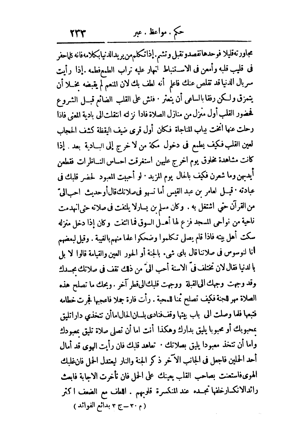مجاورته قليلا فوحدها تقصد وتقبل وتشم إذا تكلم من يريد الدنيا بكلامه فإنه كلما حفر في قليب قلبه وأمعن في الاستنباط انهار عليه تراب الطمع فطمه إذا رأيت سربال الدنيا قد تقلص عنك فاعلم أنه لطف بك لأن المنعم لم يقبضه بخلا أن يتمزق ولكن رفقا بالساعي أن يتعثر فتش على القلب الضائع قبل الشروع فحضور القلب أول منزل من منازل الصلاة فإذا نزلته أنتقلت إلى بادية المعنى فإذا رحلت عنها أنخت بباب المناجاة فكان أول قرى ضيف اليقظة كشف الحجاب لعين القلب فكيف يطمع في دخول مكة من لا خرج إلى البادية بعد. إذا كانت مشاهدة مخلوق يوم أخرج عليهن استغرقت إحساس الناظرات فقطعن أيديهن وما شعرن فكيف بالحال يوم المزيد. لو أحببت العبود لحضر قلبك في عبادته قيل لعامر بن عبد القيس أما تسهو في صلاتك قال أو حديث أحب إلى من القرآن حتى استغل به. وكان مسلم بن يسار لا يلتفت في صلاته حتى انهدمت ناحية من نواحي المسجد فزع لها أهل السوق فما التفت وكان إذا دخل منزله سكت أهل بيته فإذا قام يصلي تكلموا وضحكوا علما منهم بالغيبة. وقيل لبعضهم إنا لنوسوس في صلاتنا قال بأي شيء بالجنة أو الحور العين والقيامة قالوا لا بل بالدنيا فقال لأن تختلف في الأسنة أحب إلي من ذلك تقف في صلاتك بجسدك وقد وجهت وجهك إلى القبلة ووجهت قلبك إلى قطر آخر ويحك ما تصلح هذه الصلاة مهرا للجنة فكيف تصلح ثمنا للمحبة.. رأت فأرة جملا فأعجبها فجرت خطامه فتبعها فلما وصلت إلى باب بيتها وقف فنادى بلسان الحال إما أن تتخذي دارا تليق بمحبوبك أو محبوبا يليق بدارك وهكذا أنت إما أن تصلي صلاة تليق بمعبودك وإما أن تتخذ معبودا يليق بصلاتك. تعاهد قلبك فإن رأيت الهوى قد أمال أحد الحملين فاجعل في الجانب الآخر ذكر الجنة والنار ليعتدل الحمل فإن غلبك الهوى فاستعنت بصأحب القلب يعينك على الحمل فإن تأخرت الأجابة فابعث رائد الانكسار خلفها تجده عند المنكسرة قلوبهم اللطف مع الضعف أكثر