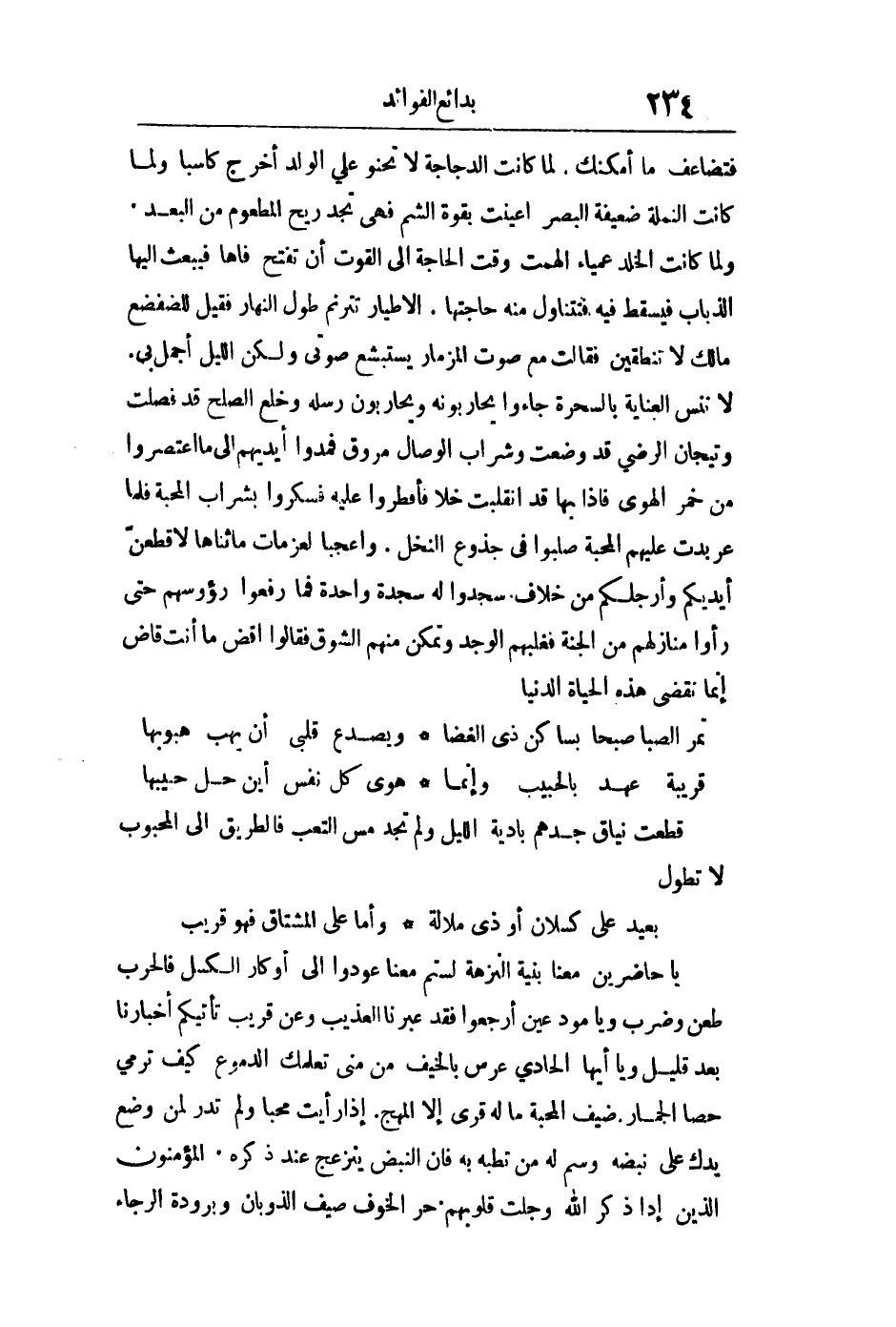 يا حاضرين معنا بنية النزهة لستم معنا عودوا إلى أوكار الكسل فالحرب طعن وضرب ويا مودعين ارجعوا فقد عبرنا العذيب وعن قريب تأتيكم أخبارنا بعد قليل ويا أيها الحادث عرس بالخيف من منى تعلمك الدموع كيف ترمى حصا الجمار. ضيف المحبة ما له قرى إلا المهج. إذا رأيت محبا ولم تدر لمن وضع يدك على نبضه وسم له من تطبه به فإن النبض ينزعج عند ذكره. المؤمنون الذين إذا ذكر الله وجلت قلوبهم. حر الخوف صيف الذوبان وبرودة الرجاء