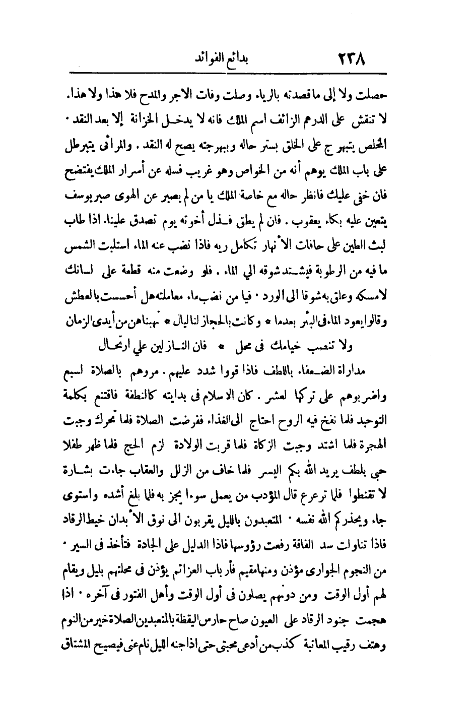 مداراة الضعفاء باللطف فإذا قووا شدد عليهم. مروهم بالصلاة لسبع واضربوهم على تركها لعشر. كان الإسلام في بدايته كالنطفة فاقتنع بكلمة التوحيد فلما نفخ فيه الروح احتاج إلى الغذاء ففرضت الصلاة فلما تحرك وجبت الهجرة فلما اشتد وجبت الزكاة فلما قربت الولادة لزم الحج فلما ظهر طفلا حبا بلطف يريد الله بكم اليسر فلما خاف من الزلل والعقاب جاءت بشارة لا تقنطوا فلما ترعرع قال المؤدب من يعمل سوءا يجز به فلما بلغ أشده واستوى جاء ويحذركم الله نفسه. المتعبدون بالليل يقربون إلى نوق الأبدان خيط الرقاد فإذا تناولت سد الفاقة رفعت رؤوسها فإذا الدليل على الجادة فتأخذ في السير. من النجوم الجواري مؤذن ومنها مقيم فأرباب العزائم يؤذن في محلتهم بليل ويقام لهم أول الوقت ومن دونهم يصلون في أول الوقت وأهل الفتور في آخرة. إذا هجمت جنود الرقاد على العيون صاح حارس اليقظة بالمتعبدين الصلاة خير من النوم وهتف رقيب المعاتبة كذب من ادعى محبتي حتى إذا جنة الليل نام عني فيصيح المشتاق