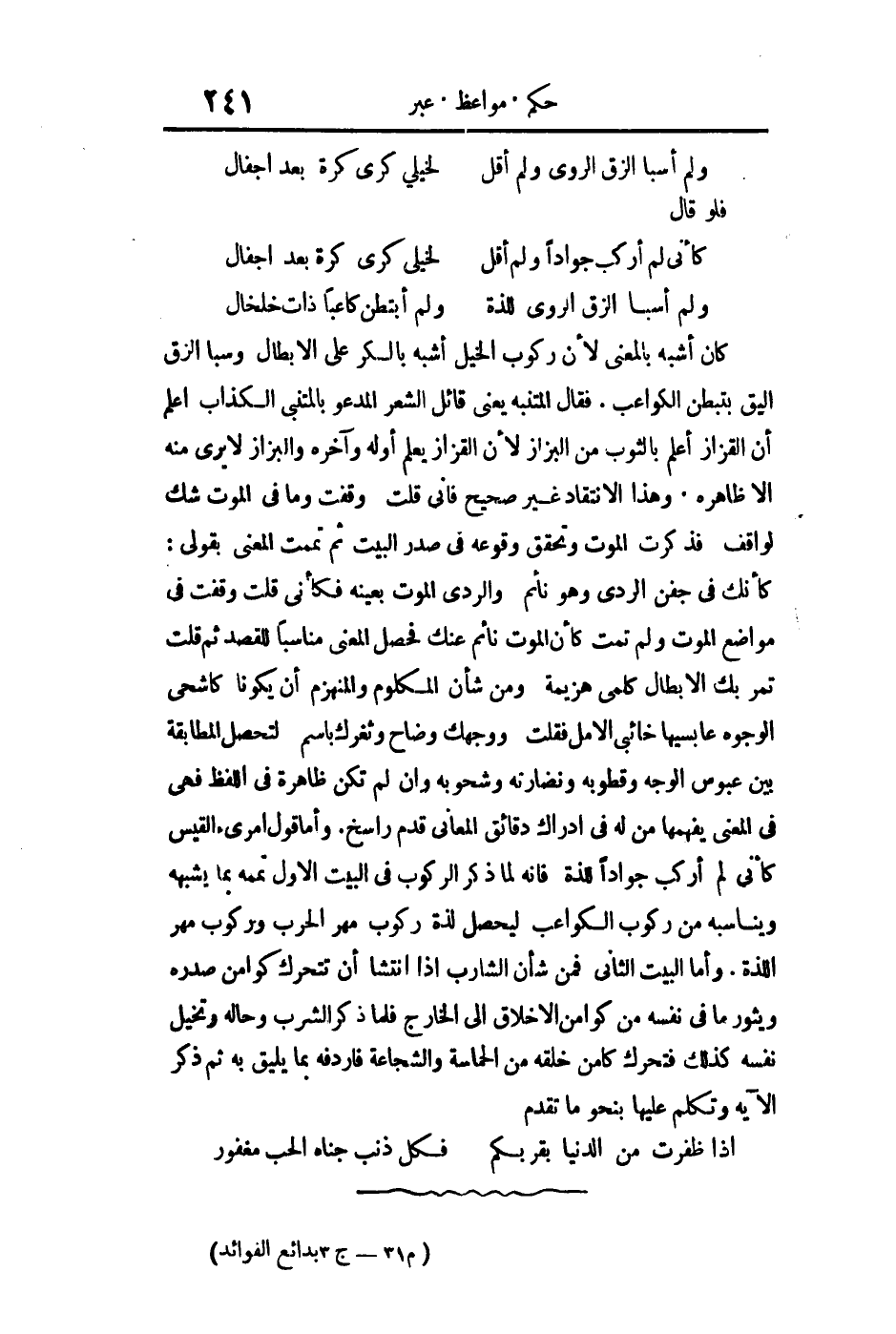 وأما البيت الثاني فمن شأن الشارب إذا أنتشي أن تتحرك كوامن صدره ويثور ما في نفسه من كوامن الأخلاق إلى الخارج فلما ذكر الشرب وحالة وتخيل نفسه كذلك فتحرك كامن خلقه من الحماسة والشجاعة فأردفه بما يليق به ثم ذكر الآية وتكلم عليها بنحو ما تقدم.