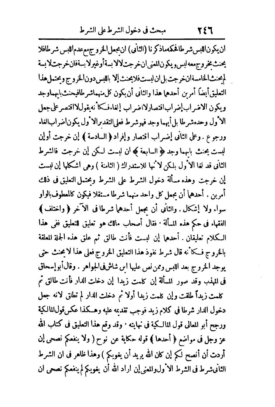 الثاني: أن يجعل الخروج مع عدم اللبس شرطا فلا يحنث بخروج معه لبس ويكون المعنى إن خرجت لا لابسه أو غير لابسة فإن خرجت لابسة لم يحنث.