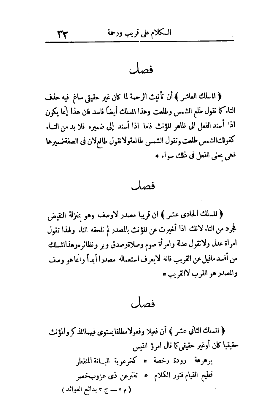 فصل: المسلك العاشر: أن تأنيث الرحمة لما كان غير حقيقي ساغ فيه حذف التاء كما تقول طلع الشمس وطلعت وهذا المسلك أيضا فاسد فإن هذا إنما يكون إذا أسند الفعل إلى ظاهر المؤنث فإما إذا أسند إلى ضميره فلا بد من التاء كقولك الشمس طلعت وتقول الشمس طالعة ولا تقول طالع لأن في الصفة ضميرها فهي بمعنى الفعل في ذلك سواء.
