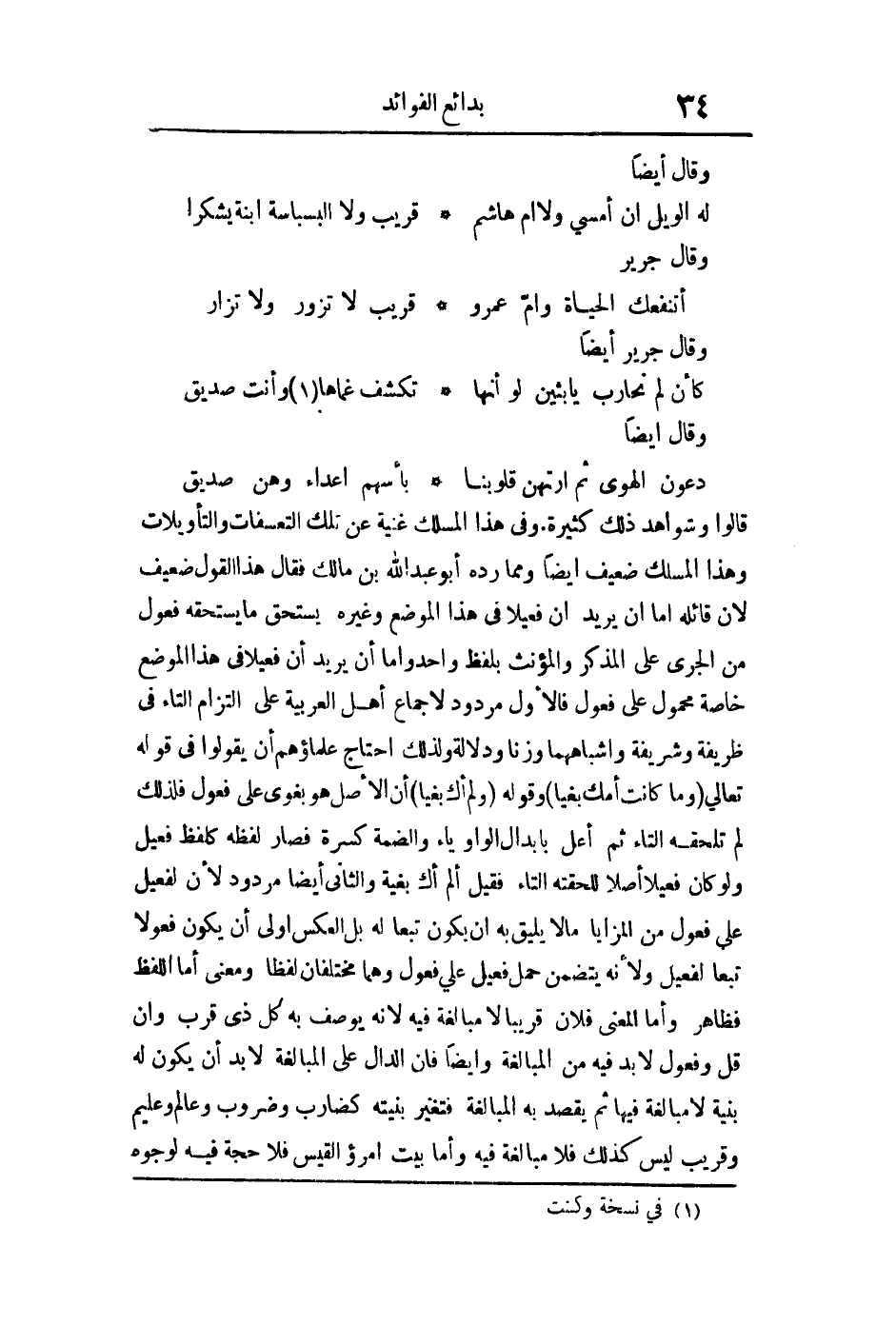 وهذا المسلك ضعيف أيضا ومما رده أبو عبد الله بن مالك فقال: هذا القول ضعيف لأن قائله إما أن يريد أن فعيلا في هذا الموضع وغيره يستحق ما يستحقه فعول من الجري على المذكر والمؤنث بلفظ واحد وإما أن يريد أن فعيلا في هذا الموضع خاصة محمول على فعول فالأول مردود لإجماع أهل العربية على التزام التاء في ظريفة وشريفة وأشباههما وزنا ودلالة" ولذلك احتاج علماؤهم أن يقولوا في قوله تعالى: {وَمَا كَانَتْ أُمُّكِ بَغِيّاً} وقوله: {وَلَمْ أَكُ بَغِيّاً} أن الأصل هو يغوى على فعول فلذلك لم تلحقه التاء ثم أعل بأبدال الواو ياء والضمة كسرة فصار لفظه كلفظ فعيل ولو كان فعيلا أصلا للحقته التاء فقيل الم أك بغية والثاني أيضا مردود لأن لفعيل على فعول من المزايا ما لا يليق به أن يكون تبعا له بل العكس أولى أن يكون فعولا تبعا لفعيل ولأنه يتضمن حمل فعيل على فعول وهما مختلفان لفظا ومعنى أما اللفظ فظاهر وأما المعنى فلأن قريبا لا مبالغة فيه لأنه يوصف به كل ذي قرب وإن قل وفعول لا بد فيه من المبالغة وأيضا فإن الدال على المبالغة لا بد أن يكون له بنية لا مبالغة فيها ثم يقصد به المبالغة فتتغير بنيته كضارب وضروب وعالم وعليم وقريب ليس كذلك فلا مبالغة فيه.