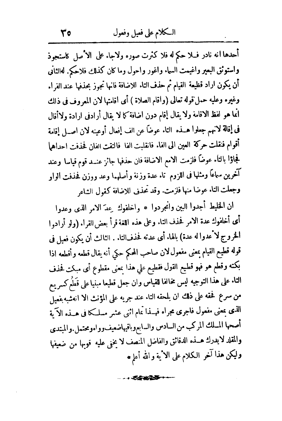 الثاني: أن يكون قد أراد قطيعة القيام ثم حذف التاء للأضافه فإنها تجوز بحذفها عند الفراء وغيره وعليه حمل قوله تعالى: {وَإِقَامَ الصَّلاةِ} أي إقامتها لأن المعروف في ذلك إنما هو لفظ الإقامة ولا يقال إقام دون أضافه كما لا يقال أراد في أرادة ولا أقال في إقالة لأنهم جعلوا هذه التاء عوضا عن ألف إفعال أو عينه لأن أصل إقامة أقوام فنقلت حركة العين إلى الفاء فانقلبت ألفا فالتقت ألفان فحذفت إحداهما فجاءوا بالتاء عوضا فلزمت إلا مع الأضافه فإن حذفها جائز عند قوم قياسا وعند أخرين سماعا ومثلها في اللزوم تاء عدة وزنة وأصلهما وعد ووزن فحذفت الواو وجعلت التاء عوضا منها فلزمت وقد تحذف للأضافه كقول الشاعر: