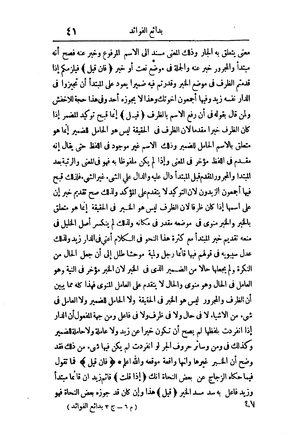 معنى يتعلق به الجار وذلك المعنى مسند إلى الاسم المرفوع وخبر عنه فصح أنه مبتدأ والمجرور خبر عنه والجملة في موضع نعت أو خبر فإن قيل فليزمكم إذا قدمتم الظرف في موضع الخبر وقدرتم فيه ضميرا يعود على المبتدأ أن تجيزوا في الدار نفسه زيد وفيها أجمعون إخوتك وهذا لا يجوزه أحد وفي هذا حجة للأخفش ولمن قال بقوله في أن رفع الاسم بالظرف قيل إنما قبح توكيد المضمر إذا كان الظرف خبرا مقدما لأن الظرف في الحقيقة ليس هو الحامل للضمير إنما هو متعلق بالاسم الحامل للضمير وذلك الاسم غير موجود في اللفظ حتى يقال إنه مقدم في اللفظ مؤخر في المعنى وإذا لم يكن ملفوظا به فهو في المعنى والرتبة بعد المبتدأ والمجرور المقدم قبل المبتدأ دال عليه والدال على الشيء غير الشيء فلذلك قبح فيها أجمعون الزيدون لأن التوكيد لا يتقدم على المؤكد ولذلك صح تقديم خبر إن على اسمها إذا كان ظرفا لأن الظرف ليس هو الخبر في الحقيقة إنما هو متعلق بالخبر والخبر منوي في موضعه مقدر في مكانه ولذلك لم ينكسر أصل الخليل في منعه تقديم خبر المبتدأ مع كثرة هذا النحو في الكلام أعني في الدار زيد ولذلك عدل سيبويه في قولهم فيها قائما رجل ولمية موحشا طلل إلى أن جعل الحال من النكرة ولم يجعلها حالا من الضمير الذي في الخبر لأن الخبر مؤخر في النية وهو العامل في الحال وهو منوي والحال لا يتقدم على العامل المنوي فهذا كله مما يبين أن الظرف والمجرور ليس هو الخبر في الحقيقة ولا الحامل للضمير ولا العامل في شيء من الأشياء لا في حال ولا في ظرف ولا في فاعل ومن جهة المفعول أن الدار إذا انفردت بلفظها لم يصح أن تكون خبرا عن زيد ولا عاملة ولا حاملة للضمير وكذلك في ومن وسائر حروف الجر لو انفردت لم يكن فيها شيء من ذلك فقد وضح أن الخبر غيرها وأنها واقعة موقعة والله أعلم.