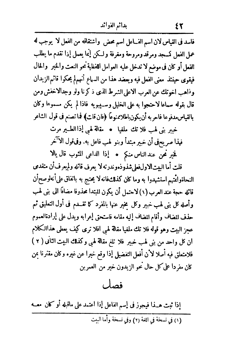 قلت أما البيت الأول فعلى شذوذه وندرته لا يعرف قائله ولم يعرف أن متقدمي النحاة وأئمتهم استشهدوا به وما كان كذلك فإنه لا يحتج به باتفاق على أنه لو صح أن قائله حجة عند العرب لاحتمل أن يكون المبتدأ محذوفا مضافا إلى بني لهب وأصله كل بني لهب خبير وكل يخبر عنها بالمفرد كما تقدم في أول التعليق ثم حذف المضاف وأقام المضاف إليه مقامه فاستحق إعرابه، ويدل على إرادة العموم عجز البيت وهو قوله فلا تك ملغيا مقالة لهبي أفلا ترى كيف يعطي هذا الكلام أن كل واحد من بني لهب خبير فلا تلغ مقالة لهبي وكذلك البيت الثاني فلا متعلق فيه أصلا لأن أفعل التفضيل إذا وقع خبرا عن غيره وكان مقترنا بمن كان مفردا على كل حال نحو الزيدون خير من العمرين.