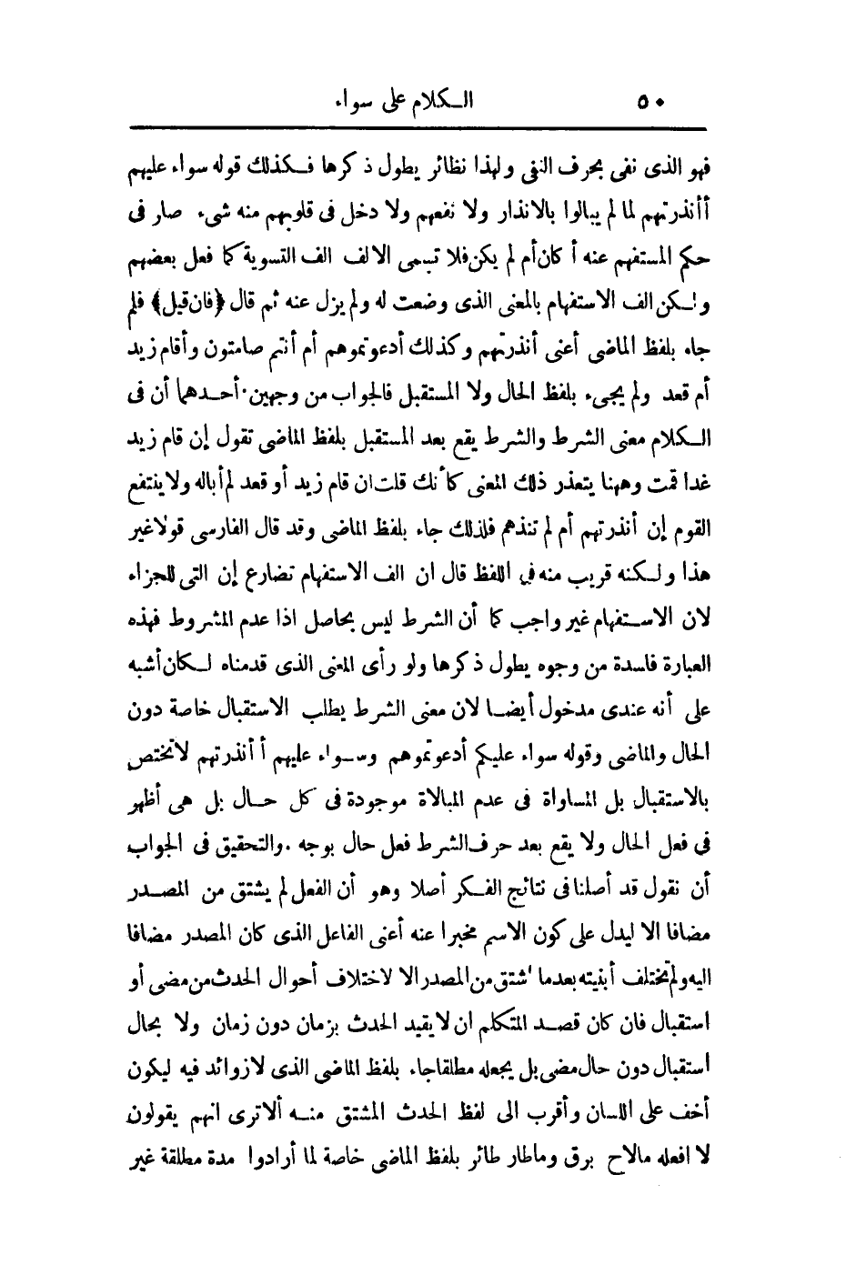 فهو الذي نفي بحرف النفي. ولهذا نظائر يطول ذكرها فكذلك قوله: {سَوَاءٌ عَلَيْهِمْ أَأَنْذَرْتَهُمْ} لما لم يبالوا بالإنذار ولا نفعهم ولا دخل في قلوبهم منه شيء صار في حكم المستفهم عنه أكان أم لم يكن فلا تسمى الألف ألف التسوية كما فعل بعضهم ولكن ألف الاستفهام بالمعنى الذي وضعت له ولم يزل عنه مجيء أنذرتهم وأدعوتهم بلفظ الماضي.
