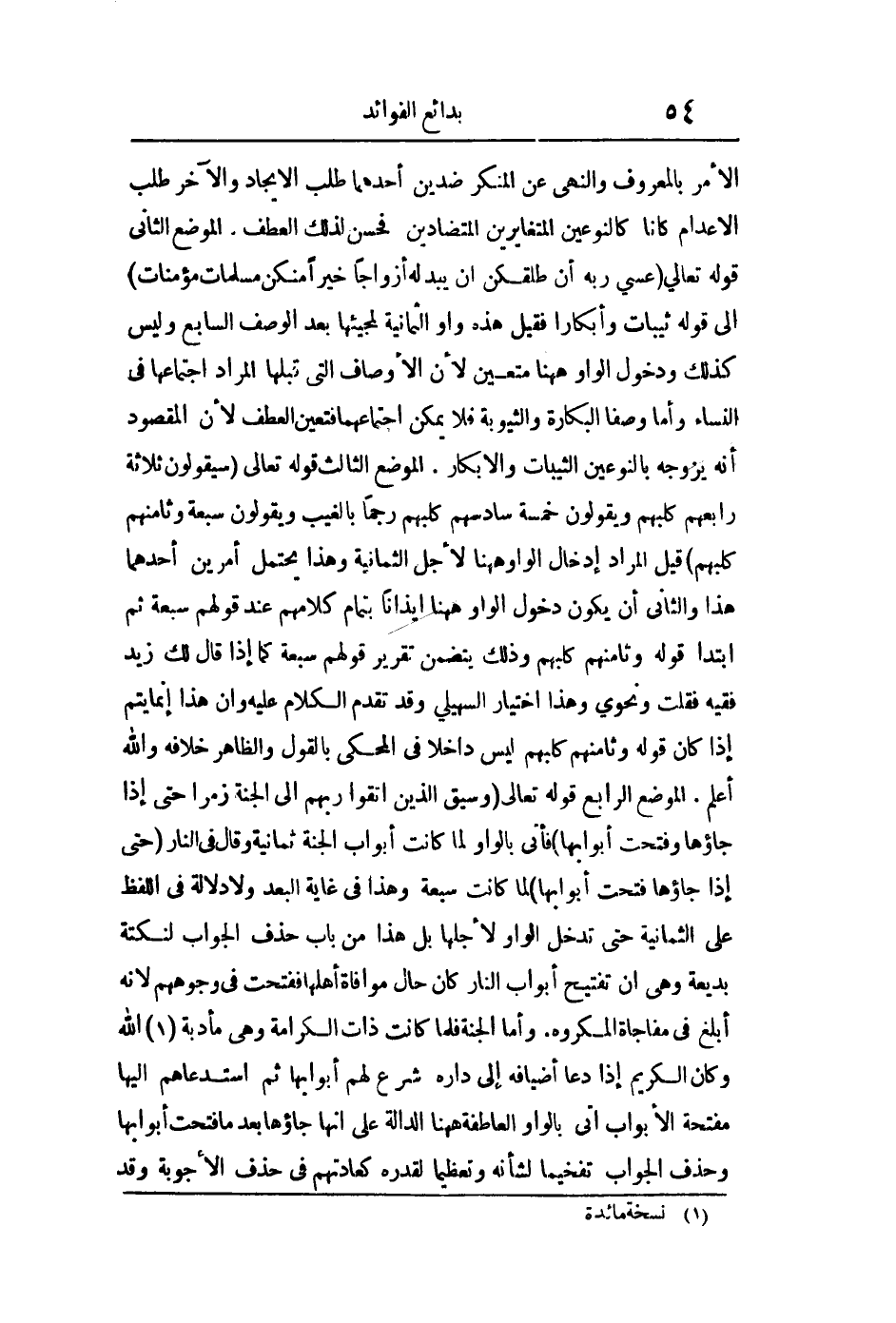 الموضع الرابع: قوله تعالى: {وَسِيقَ الَّذِينَ اتَّقَوْا رَبَّهُمْ إِلَى الْجَنَّةِ زُمَراً حَتَّى إذا جَاءُوهَا وَفُتِحَتْ أَبْوَابُهَا} فأتى بالواو لما كانت أبواب الجنة ثمانية وقال في النار {حَتَّى إذا جَاءُوهَا وَفُتِحَتْ أَبْوَابُهَا} لما كانت سبعة وهذا في غاية البعد ولا دلالة في اللفظ على الثمانية حتى تدخل الواو لأجلها بل هذا من باب حذف الجواب لنكتة بديعة وهي أن تفتيح أبواب النار كان حال موافاة أهلها ففتحت في وجوههم لأنه أبلغ في مفاجأة المكروه وأما الجنة فلما كانت ذات الكرامة وهي مأدبة الله وكان الكريم إذا دعا أضيافه إلى داره شرع لهم أبوابها ثم استدعاهم إليها مفتحة الأبواب أتى بالواو العاطفة ههنا الدالة على أنها جاءوها بعدما فتحت أبوابها وحذف الجواب تفخيما لشأنه وتعظيما لقدرة كعادتهم في حذف الأجوبة وقد