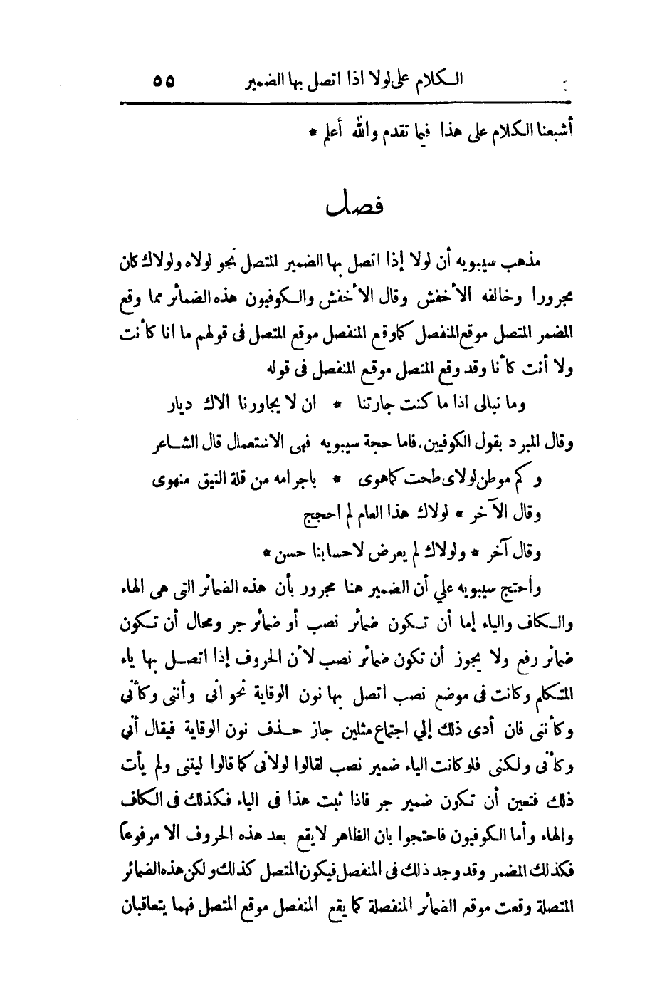 فصل: اتصال لولا بضمير متصل مذهب سيبويه أن لولا إذا اتصل بها الضمير المتصل نحو لولا هـ ولولاك كان مجرورا وخالفه الأخفش وقال الأخفش والكوفيون هذه الضمائر مما وقع المضمر المتصل موقع المنفصل كما وقع المنفصل موقع المتصل في قولهم ما أنا كأنت ولا أنت كأنا وقد وقع المتصل موقع المنفصل في قوله: