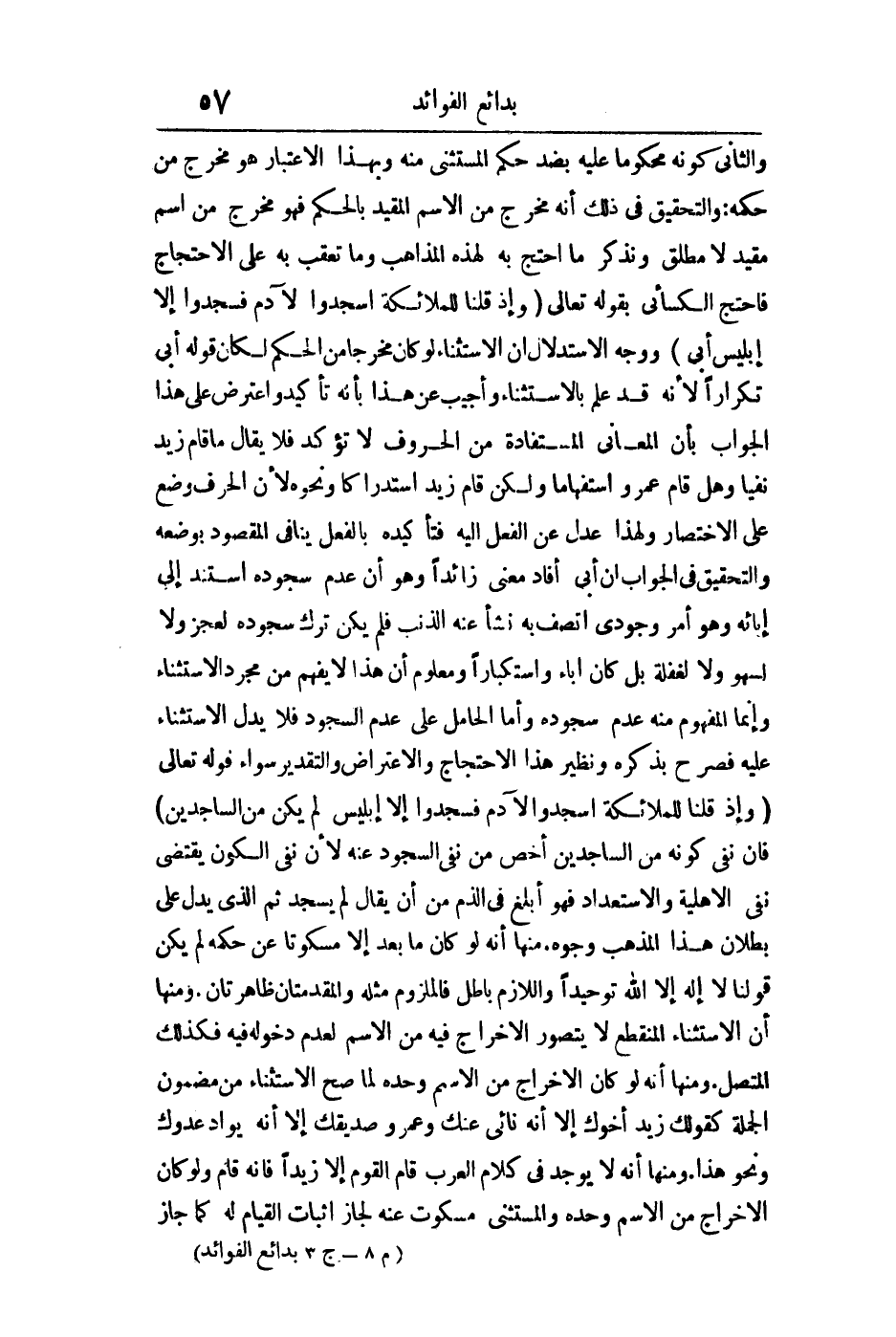 والثاني: كونه محكوما عليه بضد حكم المستثنى منه وبهذا الاعتبار هو مخرج من حكمه والتحقيق في ذلك أنه مخرج من الاسم المقيد بالحكم فهو مخرج من اسم مقيد لا مطلق الاحتجاج لكل مذهب ونذكر هنا ما احتج به لهذه المذاهب وما تعقب به على الاحتجاج احتج الكسائي بقوله تعالى: {وَإِذْ قُلْنَا لِلْمَلائِكَةِ اسْجُدُوا لآدَمَ فَسَجَدُوا إِلاّ إِبْلِيسَ أبي} ووجه الاستدلال أن الاستثناء لو كان مخرجا من الحكم لكان قوله: (أبى) تكرار لأنه قد علم بالاستثناء وأجيب عن هذا بأنه تأكيد واعترض على هذا الجواب بأن المعاني المستفادة من الحروف لا تؤكد فلا يقال ما قام زيد نفيا وهل قام عمرو استفهاما ولكن قام زيد استدراكا ونحوه لأن الحرف وضع على الاختصار ولهذا عدل عن الفعل إليه فتأكيده بالفعل ينافي المقصود بوضعه.