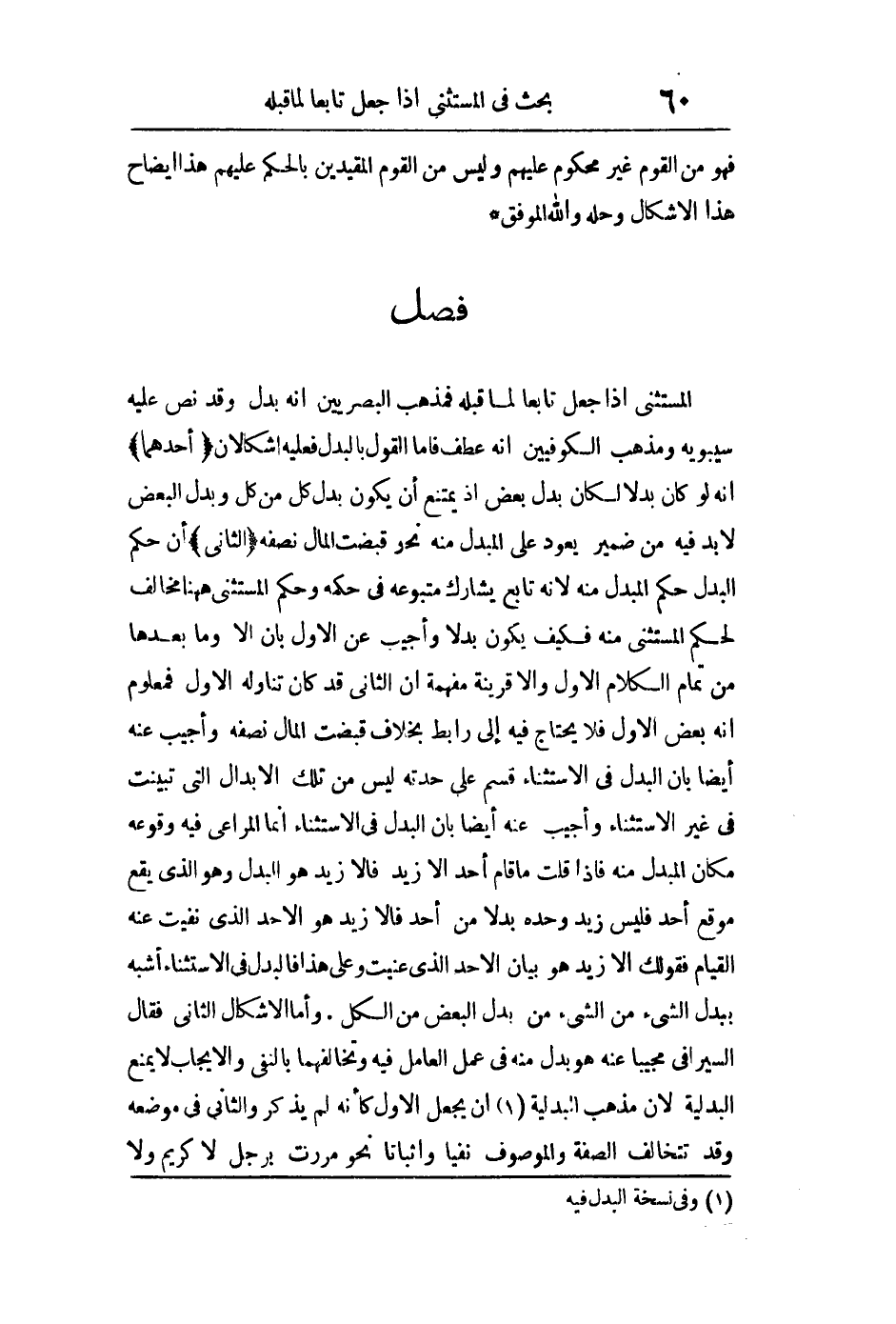 فصل: المستثني إذا جعل تابعا لما قبله فمذهب البصريين أنه بدل وقد نص عليه سيبويه ومذهب الكوفيين أنه عطف.