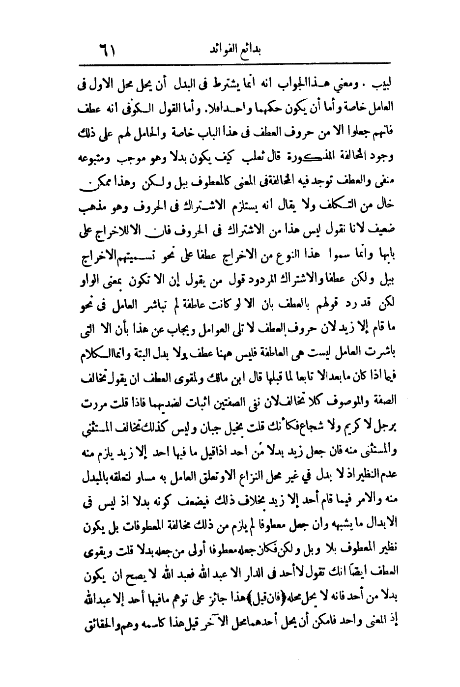 لبيب. ومعنى هذا الجواب أنه إنما يشترط في البدل أن يحل محل الأول في العامل خاصة وأما أن يكون حكمهما واحدا فلا وأما القول الكوفي أنه عطف فإنهم جعلوا إلا من حروف العطف في هذا الباب خاصة والحامل لهم على ذلك وجود المخالفة المذكورة قال ثعلب: "كيف يكون بدلا وهو موجب ومتبوعة منفي والعطف توجد فيه المخالفة في المعنى كالمعطوف بـ (بل ولكن) وهذا ممكن خال من التكلف ولا يقال إنه يستلزم الاشتراك في الحروف وهو مذهب ضعيف لأنا نقول ليس هذا من الاشتراك في الحروف فإن (إلا) للإخراج على بابها وإنما سموا هذا النوع من الآخراج عطفا على نحو تسميتةم الآخراج بـ (بل ولكن) عطفا والاشتراك المردود قول من يقول إن (إلا) تكون بمعنى الواو لكن قد رد قولهم بالعطف بأن (إلا) لو كانت عاطفة لم تباشر العامل في نحو ما قام إلا زيد لأن حروف العطف لا تلي العوامل ويجاب عن هذا بأن (إلا) التي باشرت العامل ليست هي العاطفة فليس ههنا عطف ولا بدل البتة وإنما الكلام فيما إذا كان ما بعد (إلا) تابعا لما قبلها" قال ابن مالك: "ولمقوي العطف أن يقول تخالف الصفة والموصوف كلا تخالف لأن نفي الصفتين إثبات لضديهما فإذا قلت مررت برجل لا كريم ولا شجاع فكأنك قلت بخيل جبان وليس كذلك تخالف المستثني والمستثنى منه فإن جعل زيد بدلا من أحد إذا قيل ما فيها أحد إلا زيد يلزم منه عدم النظير إذ لا يدل في غير محل النزاع إلا وتعلق العامل به مساو لتعلقه بالمبدل منه والأمر فيما قام أحد إلا زيد بخلاف ذلك فيضعف كونه بدلا إذ ليس في الأبدال ما يشبهه وإن جعل معطوفا لم يلزم من ذلك مخالف المعطوفات بل يكون نظير المعطوف بـ (لا وبل ولكن) فكان جعله معطوفا أولى من جعله بدلا".