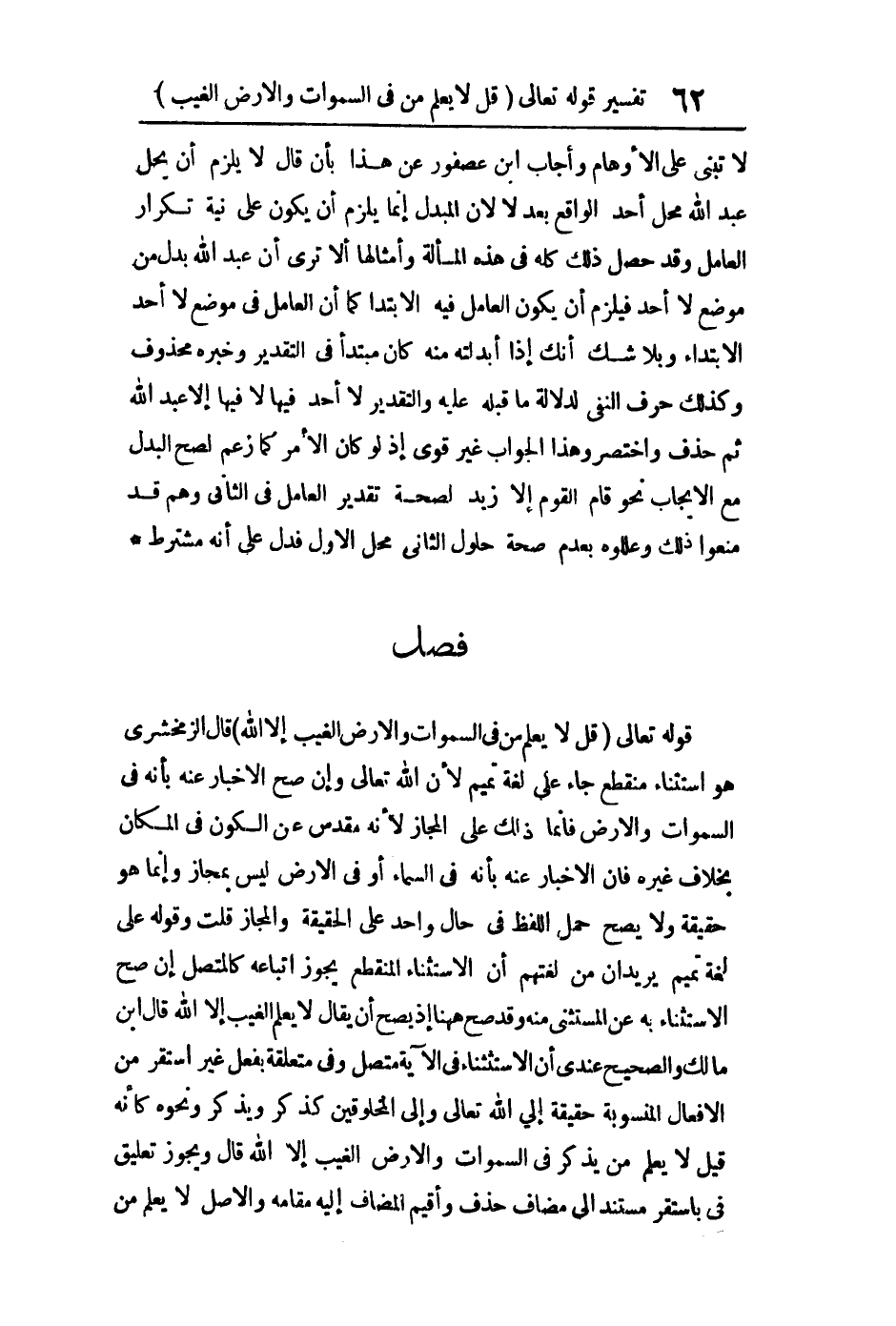 قلت: وقوله على لغة تميم يريد أن من لغتهم أن الاستثناء المنقطع يجوز إتباعه كالمتصل إن صح الاستثناء به عن المستثنى به وقد صح ههنا إذ يصح أن يقال لا يعلم الغيب إلا الله.