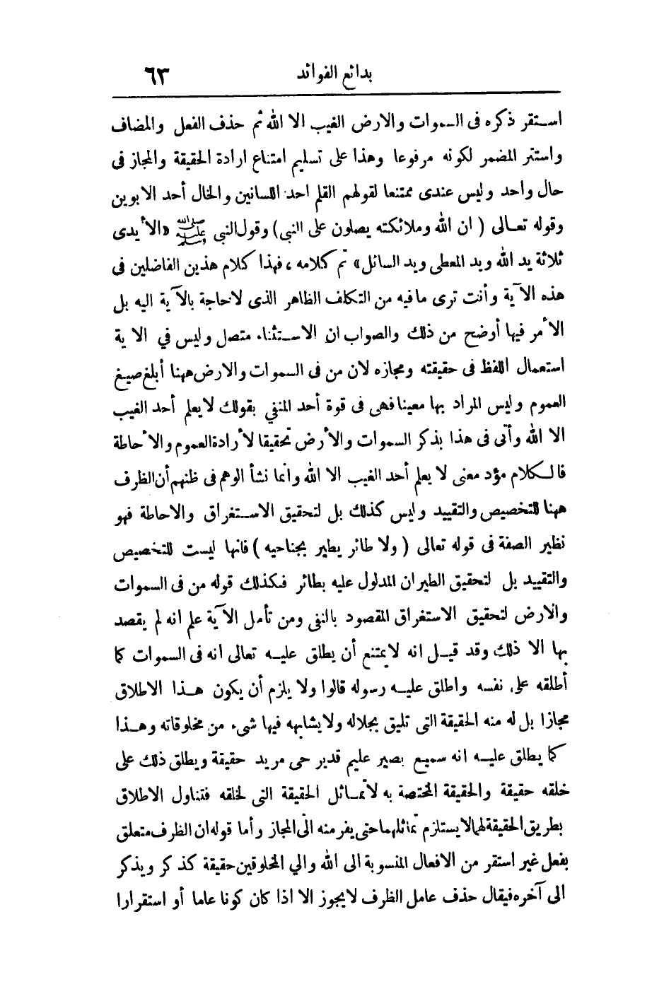 فهذا كلام هذين الفاضلين في هذه الآية وأنت ترى ما فيه من التكلف الظاهر الذي لا حاجة بالآية إليه بل الأمر فيها أوضح من ذلك الصواب في الاستثناء في هذه الآية والصواب أن الاستثناء متصل وليس في الآية استعمال اللفظ في حقيقة ومجازة لأن من في السموات والأرض ههنا أبلغ صيغ العموم وليس المراد بها معينا فهي في قوة أحد المنفي بقولك: لا يعلم أحد الغيب إلا الله وأتى في هذا بذكر السموات والأرض أحد المنفي بقولك: لا يعلم أحد الغيب إلا الله وأتى في هذا بذكر السموات والأرض تحقيقا لإرادة العموم والإحاطة فالكلام مؤد معنى لا يعلم أحد الغيب إلا الله وإنما نشأ الوهم في ظنهم أن الظرف ههنا للتخصيص والتقييد وليس كذلك بل لتحقيق الاستغراق والإحاطة فهو نظير الصفة في قوله تعالى: {وَلا طَائِرٍ يَطِيرُ بِجَنَاحَيْهِ} فإنها ليست للتخصيص والتقييد بل لتحقيق الطيران المدلول عليه بطائر فكذلك قوله: {مَنْ فِي السَّمَاوَاتِ وَالأرض} لتحقيق الاستغراق المقصود بالنفي ومن تأمل الآية علم أنه لم يقصد بها إلا ذلك وقد قيل أنه لا يمتنع أن يطلق عليه تعالى أنه في السموات كما أطلقه على نفسه وأطلق عليه رسوله قالوا ولا يلزم أن يكون هذا الإطلاق مجاز بل له منه الحقيقة التي تليق بجلاله ولا يشابهه فيها شيء من مخلوقاته وهذا كما يطلق عليه أنه سميع بصير عليم قدير حي مريد حقيقة ويطلق ذلك على خلقه حقيقة والحقيقة المختصة به لا تماثل الحقيقة التي لخلقه فتناول الإطلاق بطريق الحقيقة لهما لا يستلزم تماثلهما حتى يفر منه إلى المجاز.