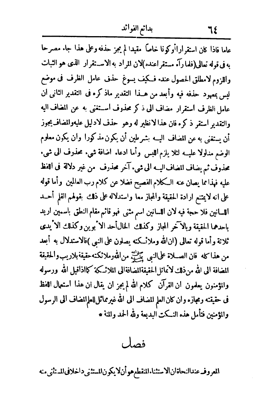 وأما قوله تعالى: {إِنَّ اللَّهَ وَمَلائِكَتَهُ يُصَلُّونَ عَلَى النَّبِيّ} فالاستدلال به أبعد من هذا كله فإن الصلاة على النبي صلى الله عليه وسلم الله وملائكته حقيقة بلا ريب والحقيقة المضافة إلى الله من ذلك لا تماثل الحقيقة المضافة إلى الملائكة كما إذا قيل الله ورسوله والمؤمنون يعلمون أن القرآن كلام الله لم يجز أن يقال إن هذا استعمال اللفظ في حقيقتة ومجازه وإن كان العلم المضاف إلى الله غير مماثل للعلم المضاف إلى الرسول والمؤمنين فتأمل هذه النكت البديعة ولله الحمد والمنة.