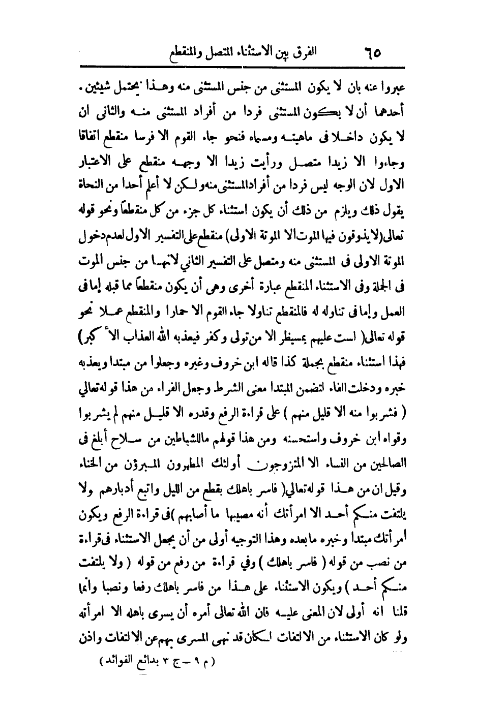 الثاني: أن لا يكون داخلا في ماهيته ومسماه فنحو جاء القوم إلا فرسا منقطع اتفاقا وجاءوا إلا زيدا متصل ورأيت زيدا إلا وجهه منقطع على الاعتبار الأول لأن الوجه ليس فردا من أفراد المستثنى منه ولكن لا أعلم أحدا من النحاة يقول ذلك ويلزم من ذلك أن يكون استثناء كل جزء من كل منقطعا ونحو قوله تعالى: {لا يَذُوقُونَ فِيهَا الْمَوْتَ إِلاّ الْمَوْتَةَ الأُولَى} منقطع على التفسير الأول لعدم دخول الموتة الأولى في المستثنى منه متصل على التفسير الثاني لأنها من جنس الموت في الجملة وفي الاستثناء المنقطع عبارة أخرى وهي أن يكون منقطعا مما قبله إما في العمل إما في تناوله له فالمنقطع تناولا جاء القوم إلا حمارا والمنقطع عملا نحو قوله تعالى: {لَسْتَ عَلَيْهِمْ بِمُصَيْطِرٍ إِلاّ مَنْ تَوَلَّى وَكَفَرَ فَيُعَذِّبُهُ اللَّهُ الْعَذَابَ الأكْبَرَ} فهذا استثناء منقطع بجملة كذا قاله ابن خروف وغيره وجعلوا من مبتدأ ويعذبه خبره ودخلت الفاء لتضمن المبتدأ معنى الشرط وجعل الفراء من هذا قوله تعالى: {فَشَرِبُوا مِنْهُ إِلاّ قَلِيلاً مِنْهُمْ} على قراءة الرفع وقدره إلا قليل منهم لم يشربوا وقواه ابن خروف واستحسنه، ومن هذا قولهم: "ما للشياطين من سلاح أبلغ في الصالحين من النساء إلا المتزوجون أولئك المطهرون المبرؤون من الخناء" وقيل إن من هذا قوله تعالى: {فَأَسْرِ بِأَهْلِكَ بِقِطْعٍ مِنَ اللَّيْلِ وَلا يَلْتَفِتْ مِنْكُمْ أَحَدٌ إِلاّ امْرَأَتَكَ إِنَّهُ مُصِيبُهَا مَا أَصَابَهُمْ} في قراءة الرفع ويكون امرأتك مبتدأ وخبره ما بعده وهذا التوجيه أولى من أن يجعل الاستثناء في قراءة من نصب من قوله: {فَأَسْرِ بِأَهْلِكَ} وفي قراءة من رفع من قوله: {وَلا يَلْتَفِتْ مِنْكُمْ أَحَدٌ} ويكون الاستثناء على هذا من فأسر بأهلك رفعا ونصبا وإنما قلنا إنه أولى لأن المعنى عليه فإن الله تعالى أمره أن يسري بأهله إلا امرأته ولو كان الاستثناء من الالتفات لكان قد نهي المسري بهم عن الالتفات وأذن