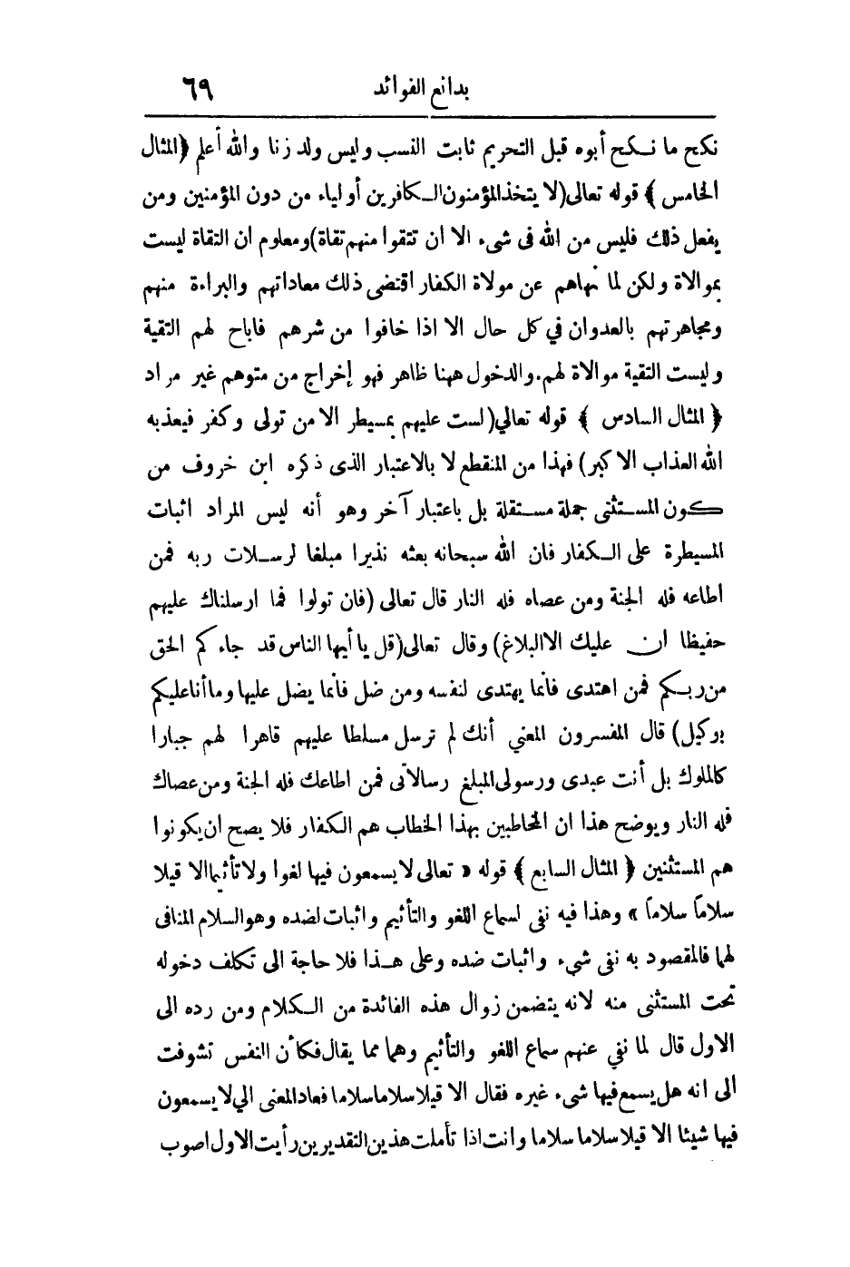 المثال السابع: قوله تعالى: {لا يَسْمَعُونَ فِيهَا لَغْواً وَلا تَأْثِيماً إِلاّ قِيلاً سَلاماً سَلاماً} وهذا فيه نفي لسماع اللغو والتأثيم وإثبات لضده وهو السلام المنافي لهما فالمقصود به نفي شيء وإثبات ضده وعلى هذا فلا حاجة إلى تكلف دخوله تحت المستثنى منه لأنه يتضمن زوال هذه الفائدة من الكلام ومن رده إلى الأول قال لما نفي عنهم سماع اللغو والتأثيم وهما مما يقال فكأن النفس تشوفت إلى أنه هل يسمع فيها شيء غيره فقال: {إِلاّ قِيلاً سَلاماً سَلاماً} فعاد المعنى إلى لا يسمعون فيها شيئا إلا قيلا سلاما سلاما وأنت إذا تأملت هذين التقديرين رأيت الأول أصوب