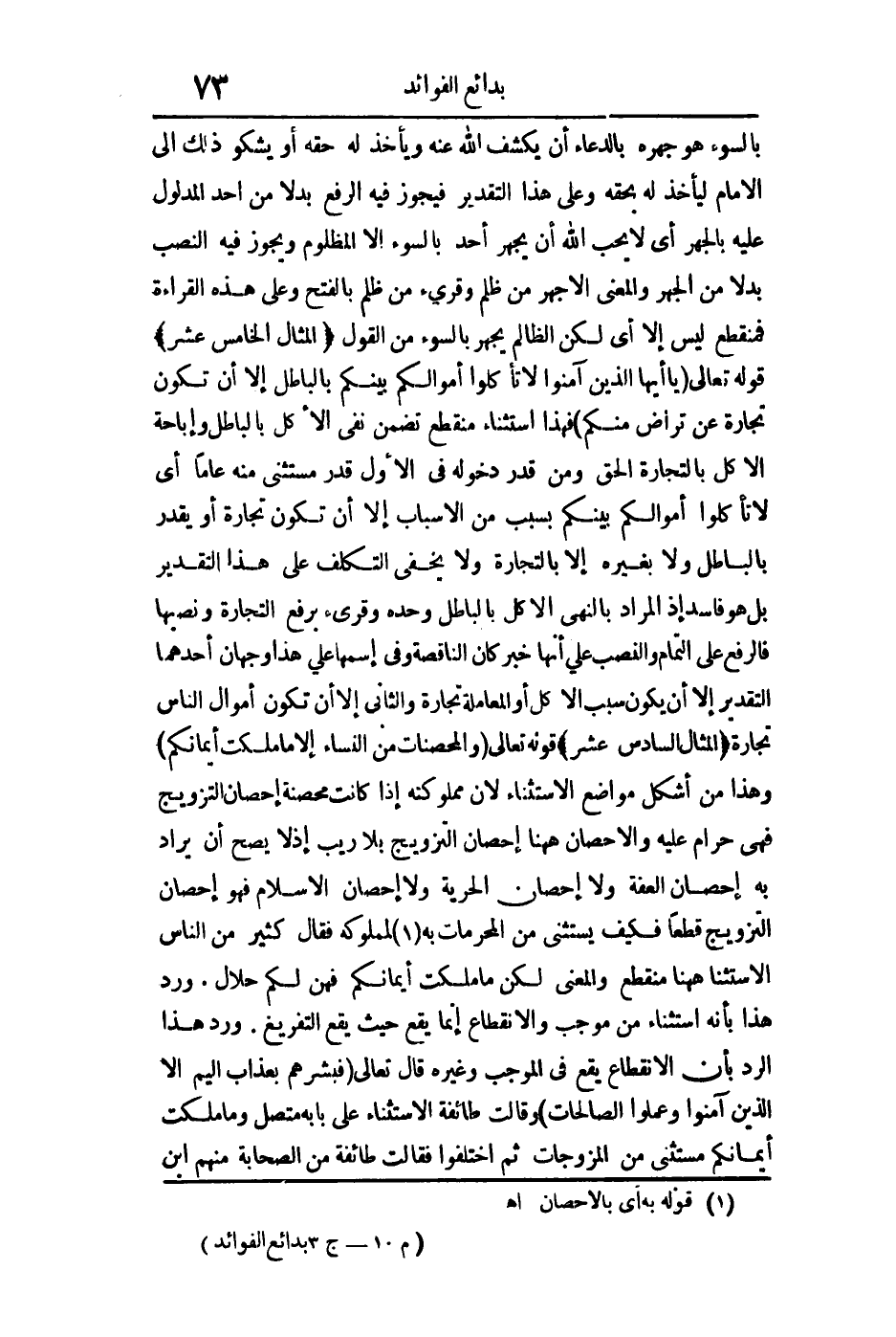 المثال السادس عشر: قوله تعالى: {وَالْمُحْصَنَاتُ مِنَ النِّسَاءِ إِلاّ مَا مَلَكَتْ أَيْمَانُكُمْ} وهذا من أشكل مواضع الاستثناء لأن مملوكته إذا كانت محصنة إحصان التزويج فهي حرام عليه والإحصان ههنا إحصان التزويج بلا ريب إذ لا يصح أن يراد به إحصان العفة ولا إحصان الحرية ولا إحصان الإسلام فهو إحصان التزويج قطعا فكيف يستثنى من المحرمات به لمملوكه فقال كثير من الناس الاستثناء ههنا منقطع والمعنى لكن ما ملكت أيمانكم فهن لكم حلال، ورد هذا بأنه استثناء من موجب والانقطاع إنما يقع حيث يقع التفريغ ورد هذا الرد بأن الانقطاع يقع في الموجب وغيره قال تعالى: {فَبَشِّرْهُمْ بِعَذَابٍ أَلِيمٍ إِلاّ الَّذِينَ آمَنُوا وَعَمِلُوا الصَّالِحَاتِ} .