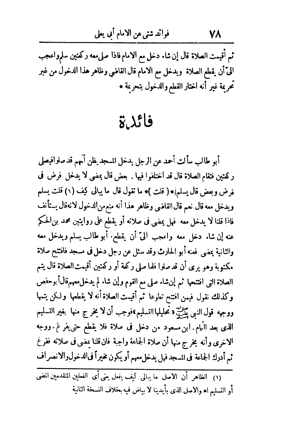 فائدة: أبو طالب سألت أحمد عن الرجل يدخل المسجد يظن أنهم قد صلوا فيصلي ركعتين فتقام الصلاة؟ قال: "قد اختلفوا فيها: بعضهم قال: يمضي لا يدخل فرض في فرض، وبعضهم قال: يسلم" قلت: ما تقول؟ قال: ما يبالي كيف، قلت: يسلم ويدخل معه؟ قال: نعم". قال القاضي: "وظاهره هذا أنه منع من الدخول لأنه قال: "يستأنف" فإذا قلنا: لا يدخل معه فهل يمضي في صلاته أو يقطع؟ على روايتين: محمد بن الحكم عنه "إن شاء دخل معه وأعجب إليّ أن يقطع"، أبو طالب: "يسلم ويدخل معه"، والثانية: "يمضي" فعنه أبو الحارث. وقد سئل عن رجل دخل في مسجد فافتتح صلاة مكتوبة وهو يرى أن قد صلوا فلما صلى ركعة أو ركعتين أقيمت الصلاة؟ قال: "يتم الصلاة التي افتتحها ثم إن شاء صلى مع القوم وإن شاء لم يدخل معهم" قال أبو حفص: "وكذلك نقول فيمن افتتح تطوعا ثم أقيمت الصلاة أنه لا يقطعها ولكن يتمها ووجهه قول النبي صلى الله عليه وسلم: "تحليلها التسليم " فوجب أن لا يخرج منها بغير التسليم الذي بعد التمام" ابن مسعود: "من دخل في صلاة فلا يقطع حتى يفرغ"، ووجه الأخرى وأنه يخرج منها أن صلاة الجماعة واجبة فإن قلنا يمضي في صلاته ففرغ ثم أدرك الجماعة في المسجد فهل يدخل معهم أو يكون مخيرا في الدخول والانصراف؟