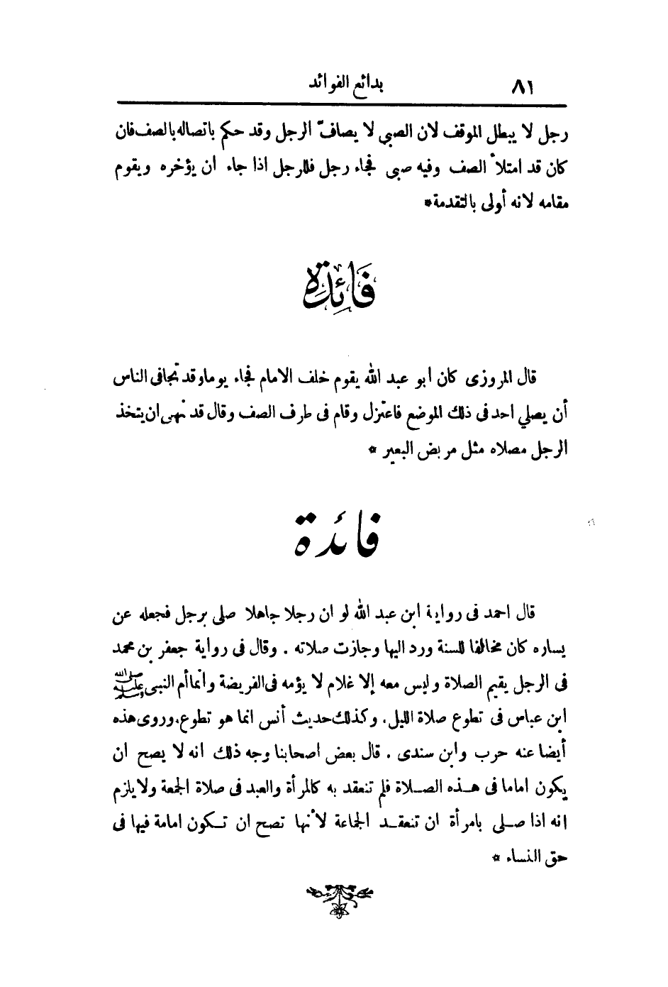 فائدة: الجاهل يصلي برجل فيجعله عن يساره قال أحمد في رواية ابن عبد الله: "لو أن رجلا جاهلا صلى برجل فجعله عن يساره كان مخالفا للسنة ورد إليها وجازت صلاته وقال في رواية جعفر بن محمد في الرجل يقيم الصلاة وليس معه إلا غلام لا يؤمه في الفريضة وإنما "أم النبي صلى الله عليه وسلم عباس في تطوع صلاة الليل" رواه البخاري ومسلم وأبو داود. وكذلك حديث أنس إنما هو تطوع رواه البخاري ومسلم والنسائي وأبو داود وروى هذه أيضا عنه حرب وابن سندي قال بعض أصحابنا: "وجه ذلك أنه لا يصح أن يكون إماما في هذه الصلاة فلم تنعقد به كالمرأة والعبد في صلاة الجمعة ولا يلزم أنه إذا صلى بامرأة أن تنعقد الجماعة لأنها تصح أن تكون إمامة فيها في حق النساء.