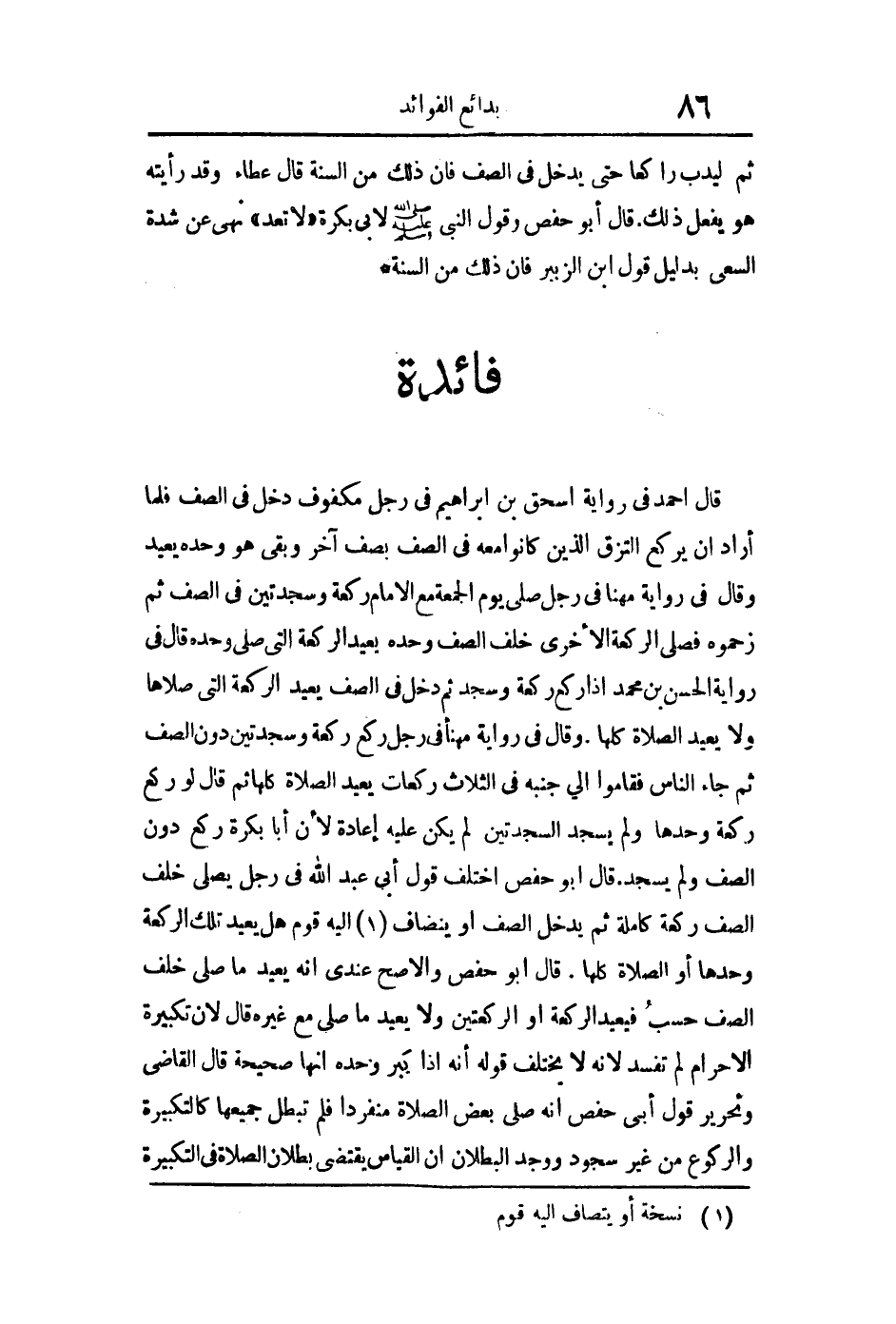 فائدة: قال أحمد في رواية إسحق بن إبراهيم في رجل مكفوف دخل في الصف فلما أراد أن يركع التزق الذين كانوا معه في الصف بصف آخر وبقي هو وحده يعيد وقال في رواية مهنا في رجل صلى يوم الجمعة مع الإمام ركعة وسجدتين في الصف ثم زحموه فصلى الركعة الأخرى خلف الصف وحده يعيد الركعة التي الركعة التي صلى وحده قال في رواية الحسن بن محمد: "إذا ركع ركعة وسجد ثم دخل في الصف يعيد الركعة التي صلاها ولا يعيد الصلاة كلها" وقال في رواية مهنا في رجل ركع ركعة وسجدتين دون الصف ثم جاء الناس فقاموا إلى جنبه في الثلاث ركعات يعيد الصلاة كلها" ثم قال: "لو ركع ركعة وحدها ولم يسجد السجدتين لم يكن عليه إعادة لأن أبا بكرة ركع دون الصف ولم يسجد" قال أبو حفص: "اختلف قول أبي عبد الله في رجل يصلي خلف الصف ركعة كاملة ثم يدخل الصف أو ينضاف إليه قوم هل يعيد تلك الركعة وحدها أو الصلاة كلها. قال أبو حفص: "والأصح عندي أنه يعيد ما صلى خلف الصف حسب فيعيد الركعة أو الركعتين ولا يعيد ما صلى مع غيره" قال: "لأن تكبيرة الإحرام لم تفسد لأنه لا يختلف قوله أنه إذا كبر وحده أنها صحيحة" قال القاضي: "وتحرير قول أبي حفص أنه صلى بعض الصلاة منفردا فلم تبطل جميعها كالتكبيرة والركوع من غير سجود ووجه البطلان أن القياس يقتضي بطلان الصلاة في التكبيرة