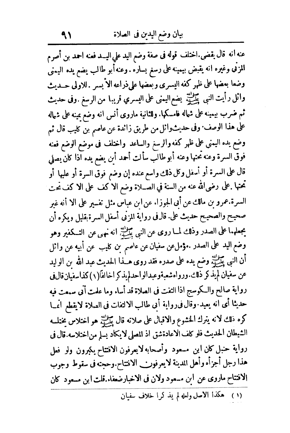 واختلف في موضع الوضع فعنه فوق السرة وعنه تحتها وعنه أبو طالب سألت أحمد أين يضع يده إذا كان يصلي؟ قال: "على السرة أو أسفل وكل ذلك واسع عنده إن وضع فوق السرة أو عليها أو تحتها" علي رضي الله عنه: "من السنة في الصلاة وضع الأكف على الأكف تحت السرة" عمرو بن مالك عن أبي الجوزاء عن ابن عباس مثل تفسير علي إلا أنه غير صحيح، والصحيح حديث علي قال في رواية المزني: "أسفل السرة بقليل ويكره أن يجعلهما على الصدر " وذلك لما روى عن النبي صلى الله عليه وسلم أنه نهي عن التكفير وهو وضع اليد على الصدر. مؤمل عن سفيان عن عاصم بن كليب عن أبيه عن وائل "أن النبي صلى الله عليه وسلم وضع يده على صدره " فقد روى هذا الحديث عبد الله بن الوليد عن سفيان لم يذكر ذلك، ورواه شعبة وعبد الواحد لم يذكرا خلاف سفيان قال في رواية صالح والكوسج: "إذا التفت في الصلاة قد أساء وما علمت أني سمعت فيه حديثا" أي أنه يعيد وقال في رواية أبي طالب: "الالتفات في الصلاة لا يقطع إنما كره لأنه يترك الخشوع والإقبال على صلاته" قال: "هو اختلاس يختلسه الشيطان " الحديث رواه البخاري والنسائي وغيرهم فلو كلف الإعادة شق إذ المصلي لا يكاد يسلم من اختلاسه.