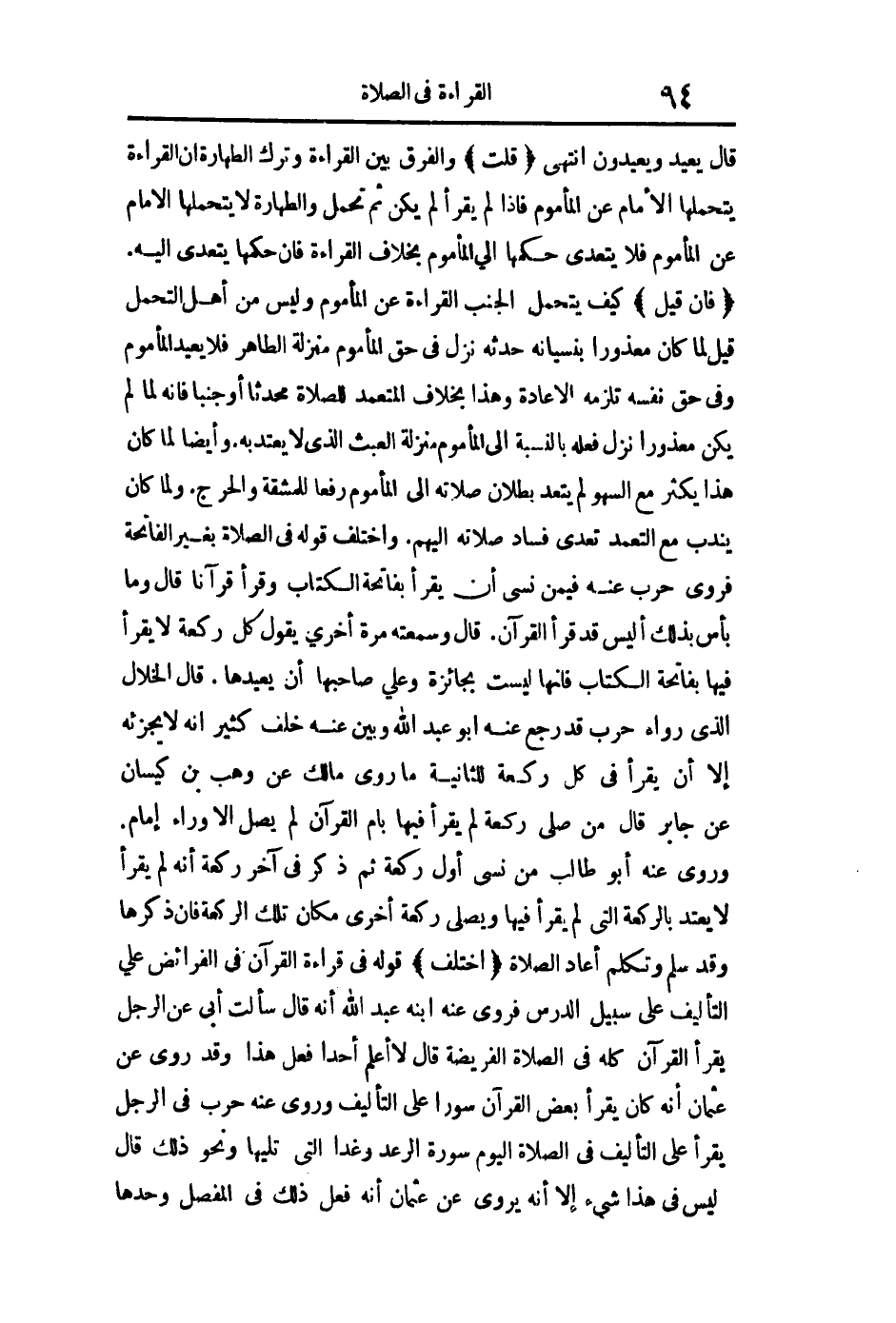 قال: "يعيد ويعيدون" انتهى قلت: والفرق بين القراءة وترك الطهارة أن القراءة يتحملها الإمام عن المأموم فإذا لم يقرأ لم يكن ثم تحمل والطهارة لا يتحملها الإمام عن المأموم فلا يتعدى حكمها إلى المأموم بخلاف القراءة فإن حكمها يتعدى إليه فإن قيل كيف يتحمل الجنب القراءة عن المأموم وليس من أهل التحمل، قيل كيف يتحمل الجنب القراءة وليس من أهل التحمل قيل لما كان معذورا بنسيانه حدثه نزل في حق المأموم منزلة الطاهر فلا يعيد المأموم وفي حق نفسه تلزمه الإعادة وهذا بخلاف المتعمد للصلاة محدثا أو جنبا فإنه لما لم يكن معذورا نزل فعله بالنسبة إلى المأموم منزلة العبث الذي لا يعتد به وأيضا لما كان هذا يكثر مع السهو لم يتعد بطلان صلاته إلى المأموم رفعا للمشقة والحرج ولما كان يندب مع التعمد تعدى فساد صلاته إليهم واختلف قوله في الصلاة بغير الفاتحة فروى حرب عنه فيمن نسي أن يقرأ بفاتحة الكتاب وقرأ قرآنا؟ قال: "وما بأس بذلك أليس قد قرأ القرآن" قال: وسمعته مرة أخرى يقول: "كل ركعة لا يقرأ فيها بفاتحة الكتاب فإنها ليست بجائزة وعلى صاحبها أن يعيدها". قال الخلال: الذي رواه حرب قد رجع عنه أبو عبد الله وبين عنه خلف كثير أنه لا يجزئه إلا أن يقرأ في كل ركعة للثانية ما روى مالك عن وهب بن كيسان عن جابر قال: "من صلى ركعة لم يقرأ فيها بأم القرآن لم يصل إلا وراء إمام" وروى عنه أبو طالب: "من نسي أول ركعة ثم ذكر في آخر ركعة أنه لم يقرأ لا يعتد بالركعة التي لم يقرأ فيها ويصلي ركعة أخرى مكان تلك الركعة فإن ذكرها وقد سلم وتكلم أعادة الصلاة.