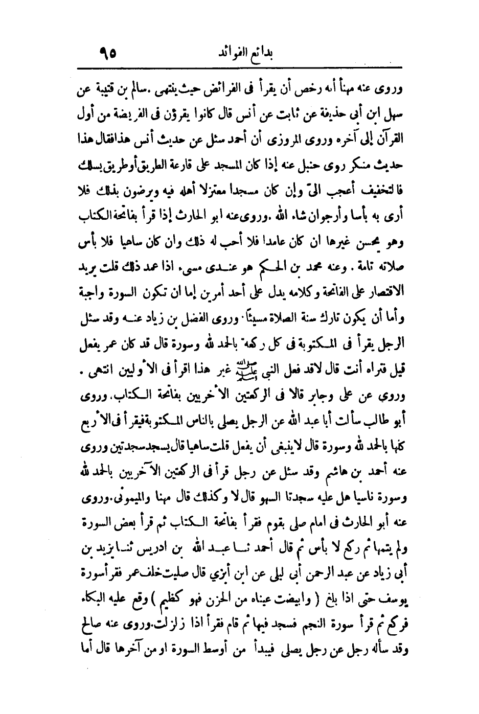 وروى عنه مهنا أنه رخص أن يقرأ في الفرائض حيث ينتهي سأل ابن قتيبة عن سهل بن أبي حذيفة عن ثابت عن أنس قال: "كانوا يقرؤون في الفريضة من أول القرآن إلى آخره" وروى المروزي أن أحمد سئل عن حديث أنس هذا فقال: "هذا حديث منكر" روى حنبل عنه "إذا كان المسجد على قارعة الطريق أو طريق يسلك فالتخفيف أعجب إلي وإن كان مسجدا معتزلا أهله فيه ويرضون بذلك فلا أرى به بأسا وأرجو إن شاء الله" وروى عنه أبو الحارث "إذا قرأ بفاتحة الكتاب وهو يحسن غيرها إن كان عامدا فلا أحب له ذلك وإن كان ساهيا فلا بأس صلاته تامة" وعنه محمد بن الحكم "هو عندي مسيء إذا عمد ذلك". قلت يريد الاقتصار على الفاتحة وكلامه يدل على أحد أمرين: إما أن تكون السورة واجبة وإما أن يكون تارك سنة الصلاة مسيئا وروى الفضل بن زياد عنه وقد سئل الرجل يقرأ في المكتوبة في كل ركعة بالحمد لله وسورة قال: قد كان عمر يفعل، قيل: فتراه؟ قال: لا قد فعل النبي صلى الله عليه وسلم غير هذا اقرأ في الأوليين" أنتهي. وروى عن علي وجابر قالا في الركعتين الآخريين بفاتحة الكتاب. وروى أبو طالب سألت أبا عبد الله عن الرجل يصلي بالناس المكتوبة فيقرأ في الأربع كلها بالحمد لله وسورة؟ قال: "لا ينبغي أن يفعل" قلت: ساهيا؟ قال: "يسجد سجدتين" وروى عنه أحمد بن هاشم وقد سئل عن رجل قرأ في الركعتين الآخريين بالحمد لله وسورة ناسيا هل عليه سجدتا السهو؟ قال: "لا" وكذلك قال مهنا والميموني. وروى عنه أبو الحارث في إمام صلى بقوم فقرأ بفاتحة الكتاب ثم قرأ بعض السورة ولم يتمها ثم ركع لا بأس ثم قال أحمد ثنا عبد الله بن إدريس ثنا يزيد بن أبي زياد عن عبد الرحمن بن أبي ليلى عن ابن أبزي قال: "صليت خلف عمرو فقرأ سورة يوسف حتى إذا بلغ {وَابْيَضَّتْ عَيْنَاهُ مِنَ الْحُزْنِ فَهُوَ كَظِيمٌ} وقع عليه البكاء فركع ثم قرأ سورة النجم فسجد فيها ثم قام فقرأ (إذا زلزلت) وروى عنه صالح وقد سأله رجل عن رجل يصلي فيبدأ من أوسط السورة أو من آخرها؟ قال: "أما