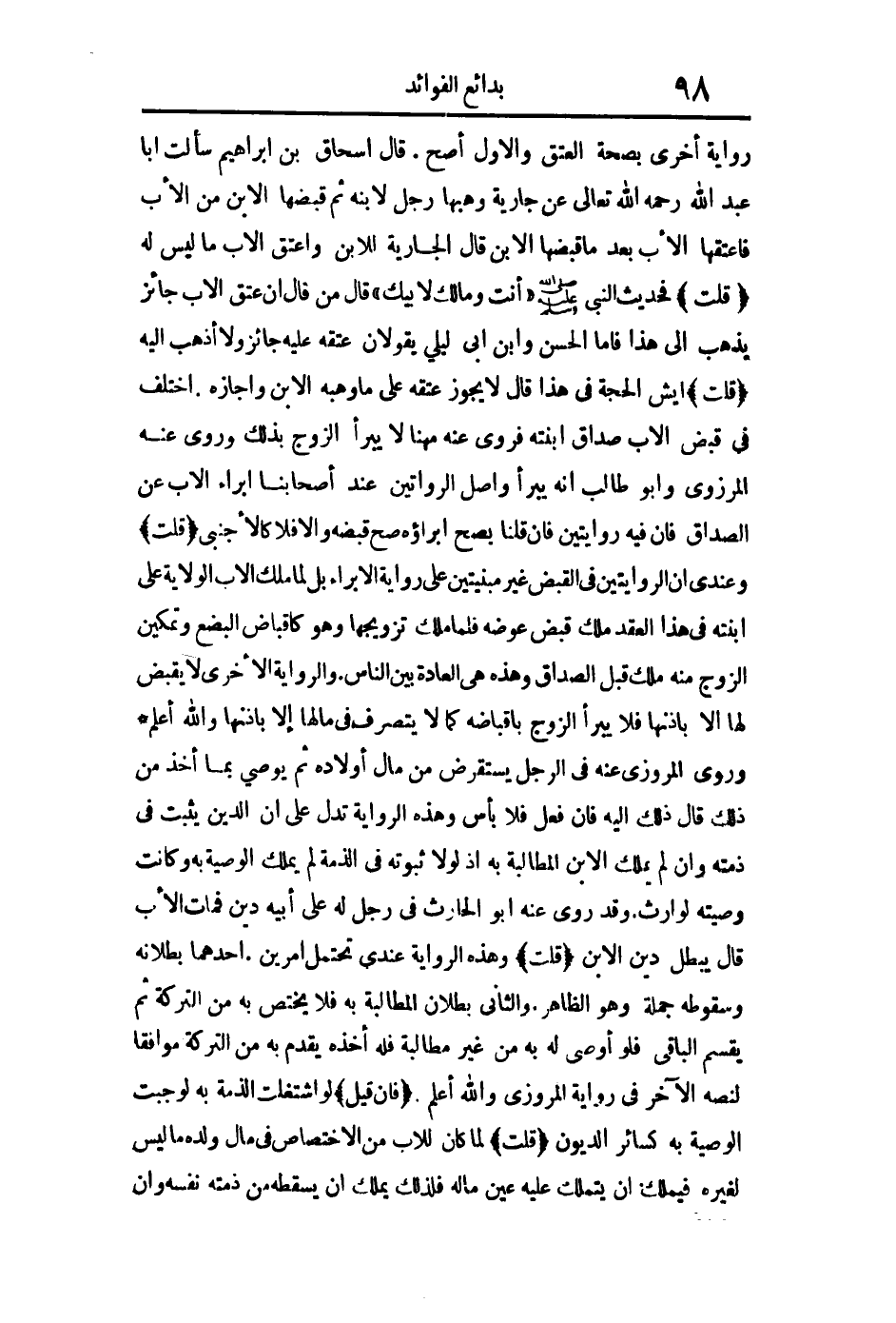 رواية أخرى بصحة العتق والأول أصح" قال إسحاق بن إبراهيم: "سألت أبا عبد الله رحمه الله تعالى عن جارية وهبها رجل لابنه ثم قبضها الابن من الأب فأعتقها الأب بعدما قبضها الابن؟ قال: "الجارية للابن وأعتق الأب ما ليس له" قلت: فحديث النبي صلى الله عليه وسلم: " أنت ومالك لأبيك" قال: "من قال أن عتق الأب جائز يذهب إلى هذا فأما الحسن وابن أبي ليلى يقولان عتقه عليه جائز ولا أذهب إليه" قلت: إيش الحجة في هذا؟ قال: "لا يجوز عتقه على ما وهبه الابن وأجازه.