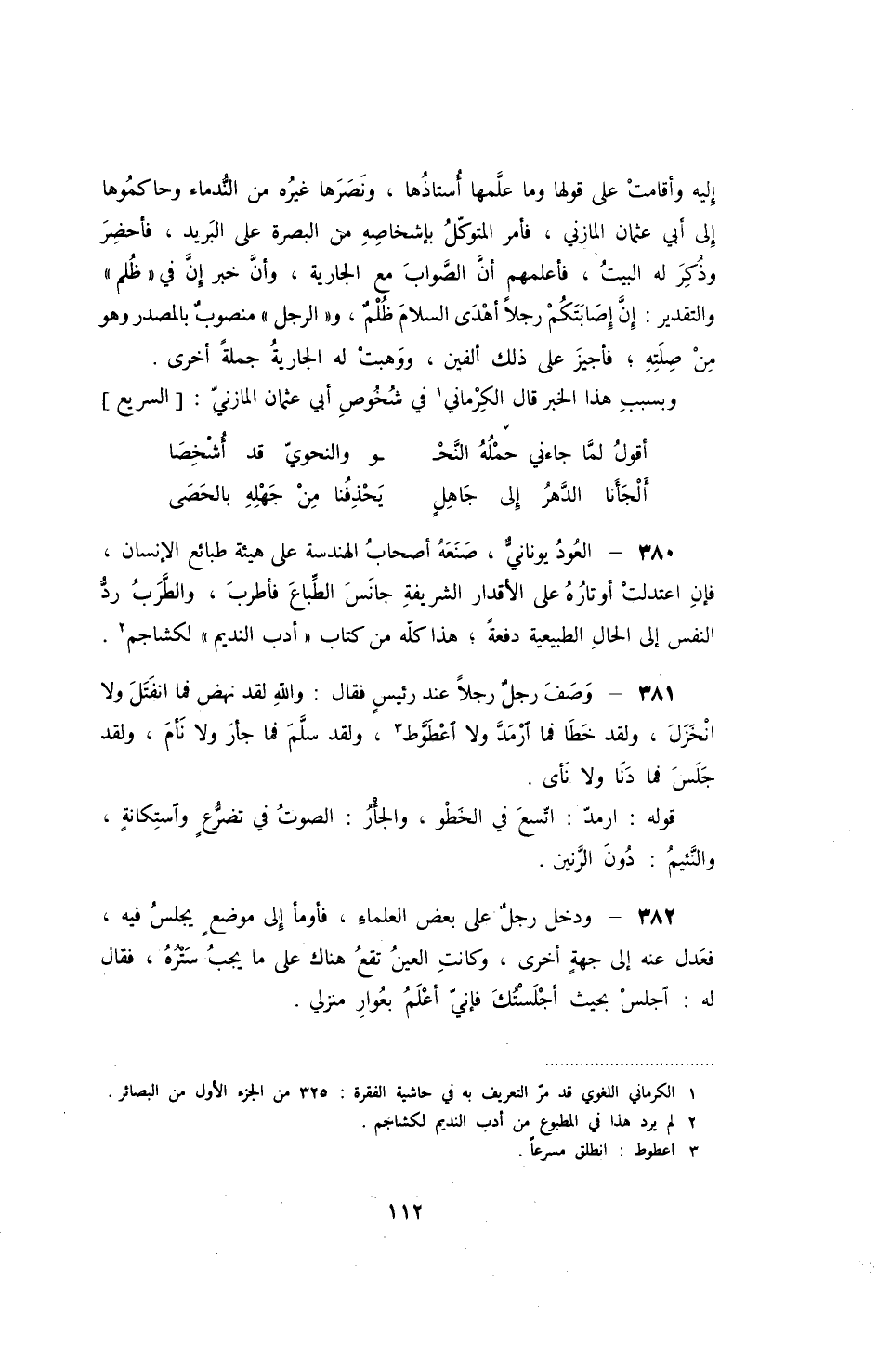 إليه وأقامت على قولها وما علمها أستاذها، ونصرها غيره من الندماء وحاكموها إلى أبي عثمان المازني، فأمر المتوكل بإشخاصه من البصرة على البريد، فأحضر وذكر له البيت، فأعلمهم أن الوصاب مع الجارية، وأن خبر إن في ظلم والتقدير: إن إصابتكم رجلاً أهدى السلام ظلم، والرجل منصوب بالمصدر وهو من صلته؛ فأجيز على ذلك ألفين، ووهبت له الجارية جملة اخرى. وبسبب هذا الخبر قال الكرماني في شخوص أبي عثمان المازني: السريع