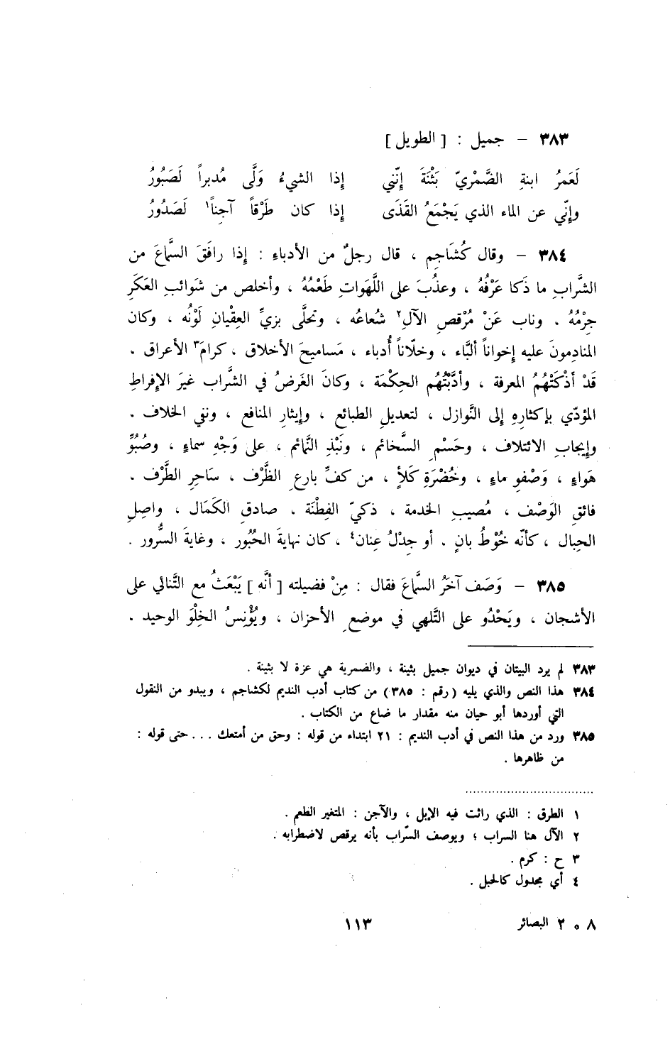 وقال كشاجم، قال رجل من الأدباء: إذا رافق السماع من الشارب ما ذكا عرفه، وعذب على اللهوات طعمه، وأخلص من شوائب العكر جرمه، وناب عن مرقص الآل شعاعه، وتحلى بزي العقبان لونه، وكان المنادمون عليه إخواناً ألباء، وخلاناً أدباء، مساميح الأخلاق، كرام الأعراق، قد أذكتهم المعرفة، وأدبتهم الحكمة وكان الغرض في الشرب غير الإفراط المؤدي بإكثاره إلى النوازل، لتعديل الطبائع، وإياثر المنافع، ونفي الخلاف، وغيجاب الائتلاف، وحسم السخائم، ونبذ النمائم، على وجه سماء، وصبو هواء، وصفو ماء، وخضرة كلأ، من كف بارع الظرف، ساحر الطرف، فائق الوصف، مصيب الخدمة، ذكي الفطنة، صادق الكمال، واصل الحبال، كأنه خوط بان، أو جدل عنان، كان نهاية الحبور، وغاية السرور.