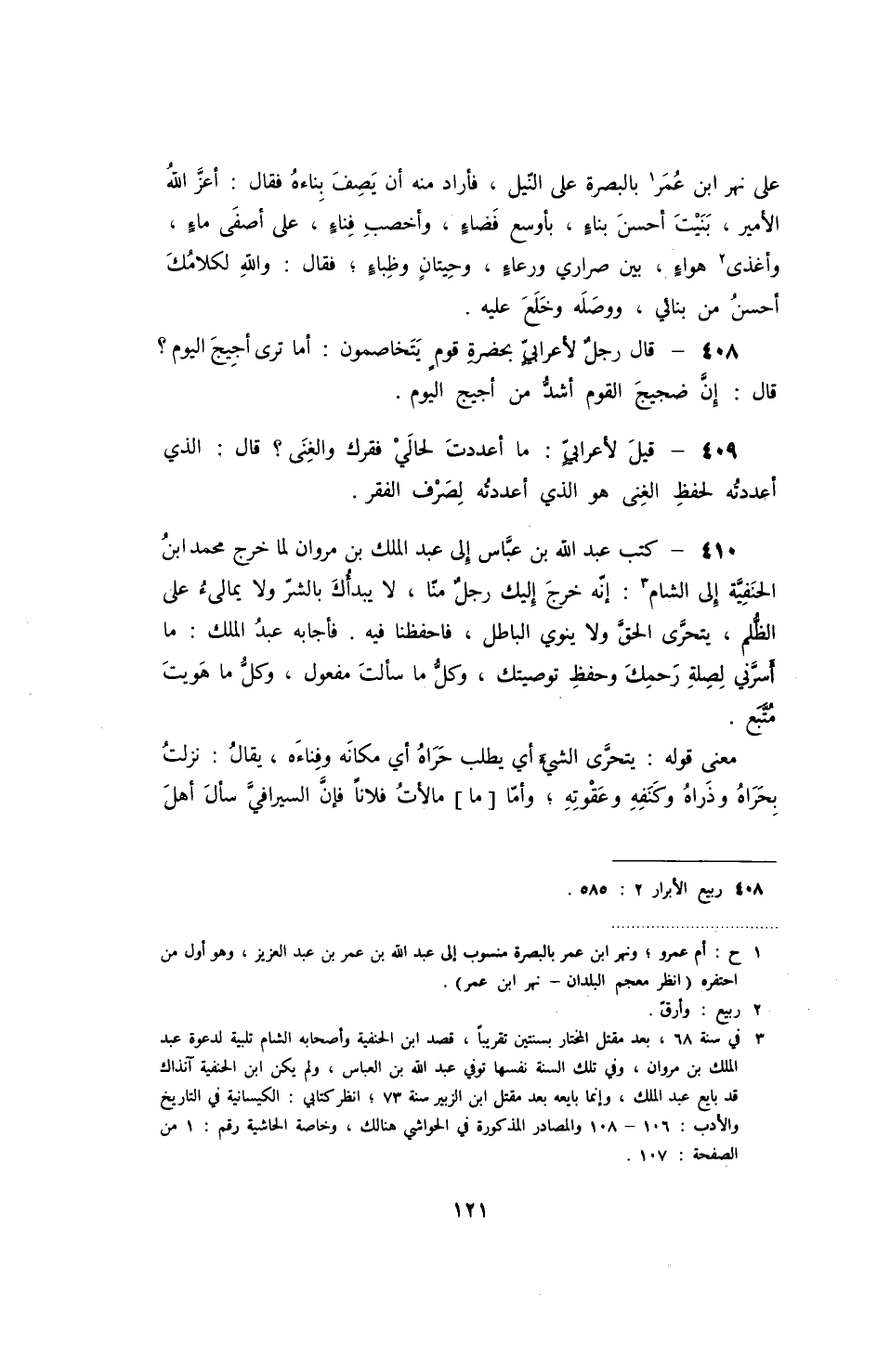 على نهر ابن عمر بالبصرة على النيل، فاراد منه أن يصف بناءه فقال: أعز الله الأمير، بنيت أحسن بناء، بأوسع فضاء، وأخصب فناء، على أصفى ماء، وأغذى هواء، وبين صراري ورعاء، وحيتان وظباء؛ فقال: والله لكلامك أحسن من بنائي، ووصله وخلع عليه.
