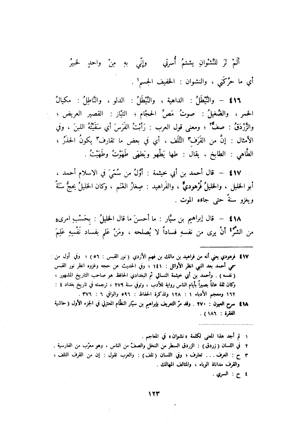 والنيطل: الداهية، والنيطل: الدلو، والناطل: مكيال الخمر، والضغيل: صوت مص الحجام؛ التياز: القصير العريض؛ والزردق: صف؛ ومعنى قول العرب: رابت الفرس أس سقيته اللبن، وفي الأمثال: إن من القرف التلف، أي في بعض ما تقارف يكون الحذر؛ الطاهي: الطابخ، يقال: طها يطهو طهوت وطهيت.