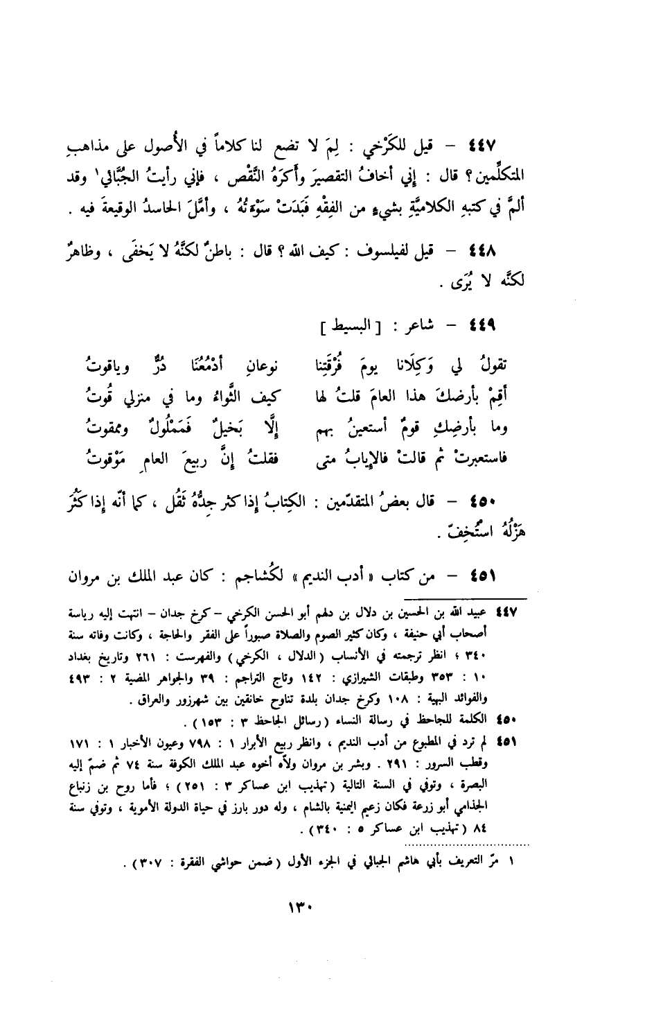 قيل للكرخي: لم لا تضع لنا كلاماً في الأصول على مذاهب المتكلمين؟ قال: أخاف التقصير وأكره النقص، فإني رأيت الجبائي وقد ألم في كتبه بشيء من الفقه فبدت سوءته، وأمل الحاسد الوقيعة فيه.