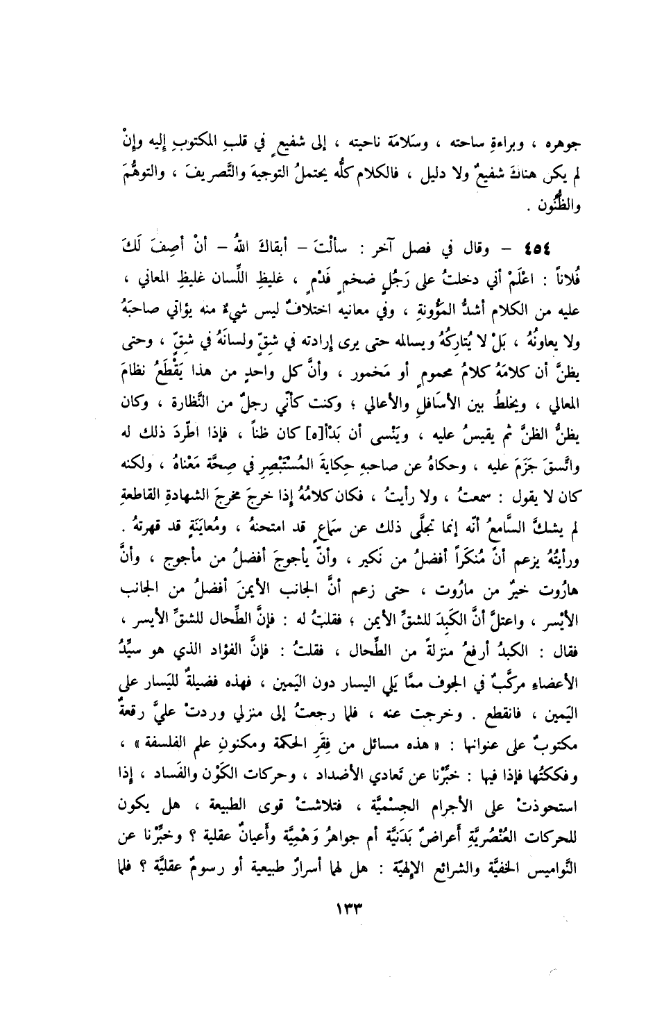 وقال في فصل آخر: سألت - أبقاك الله - أن أصف لك فلاناً: اعلم أني دخلت على رجل ضخم فدم، غليظ اللسان غليظ المعاني، عليه من الكلام أشد المؤونة، وفي معانيه اختلاف ليس شيء منه يؤاتي صاحبه ولا يعاونه، بل لا يتاركه ويسالمه حتى يرى إرادته في شق ولسانه في شق، وحتى يظن ان كلامه كلام محموم أو مخمور، وأن كل واحد من هذا يقطع نظام المعالي، ويخلط بين الأسافل والأعالي؛ وكنت كأني رجل من النظارة، وكان يظن الظن ثم يقيس عليه، وينسى أن بدأه كان ظناً، فإذا اطرج ذلك لهواتسق جزم عليه، وحكاه عن صاحبه حكاية المستبصر في صحة معناه، ولكنه كان لا يقول: سمعت، ولا رأيت، فكان كلامه إذا خرج مخرج الشهادة القاطعة لم يشك السامع أنه إنما تجلى ذلك عن سماع قد امتحنه، ومعانية قد قهرته. ورأيته يزعم أن منكراً أفضل من نكير، وأن يأجوج أفضل من مأجوج، وأن هاروت خير من ماروت، حتى زعم أن الجانب الأيمن أفضل من الجانب الأيسر، واعتل ان الكبد للشق الأيمن؛ فقلت له: فإن الطحال للشق الأيسر، فقال: الكبد أرفع منزلة من الطحال، فقلت: فإن الفؤاد الذي هو سيد الأعضاء مركب في الجوف مما يلي اليسار دون اليمين، فهذه فضيلة لليسار على اليمين، فانقطع. ورخجت عنه، فلما رجعت إلى منزلي وردت علي رقعة مكتوب على عنوانها: هذه مسائل من فقر الحكمة ومكنون علم الفلسفة، وفككتها فإذا فيها: خبرنا عن تعادي الأضداد، وحركات الكون والفساد، إذا استحوذت على الأجرام الجسمية، فتلاشت قوى الطبيعة، هل يكون للحركات العنصرية أعراض بدنية أم جواهر وهمية وأعيان عقلية؟ وخبرنا عن النواميس الخفية والشرائع الإلهية: هل لهما أسرار طبيعية أو رسوم عقلية؟ فلما