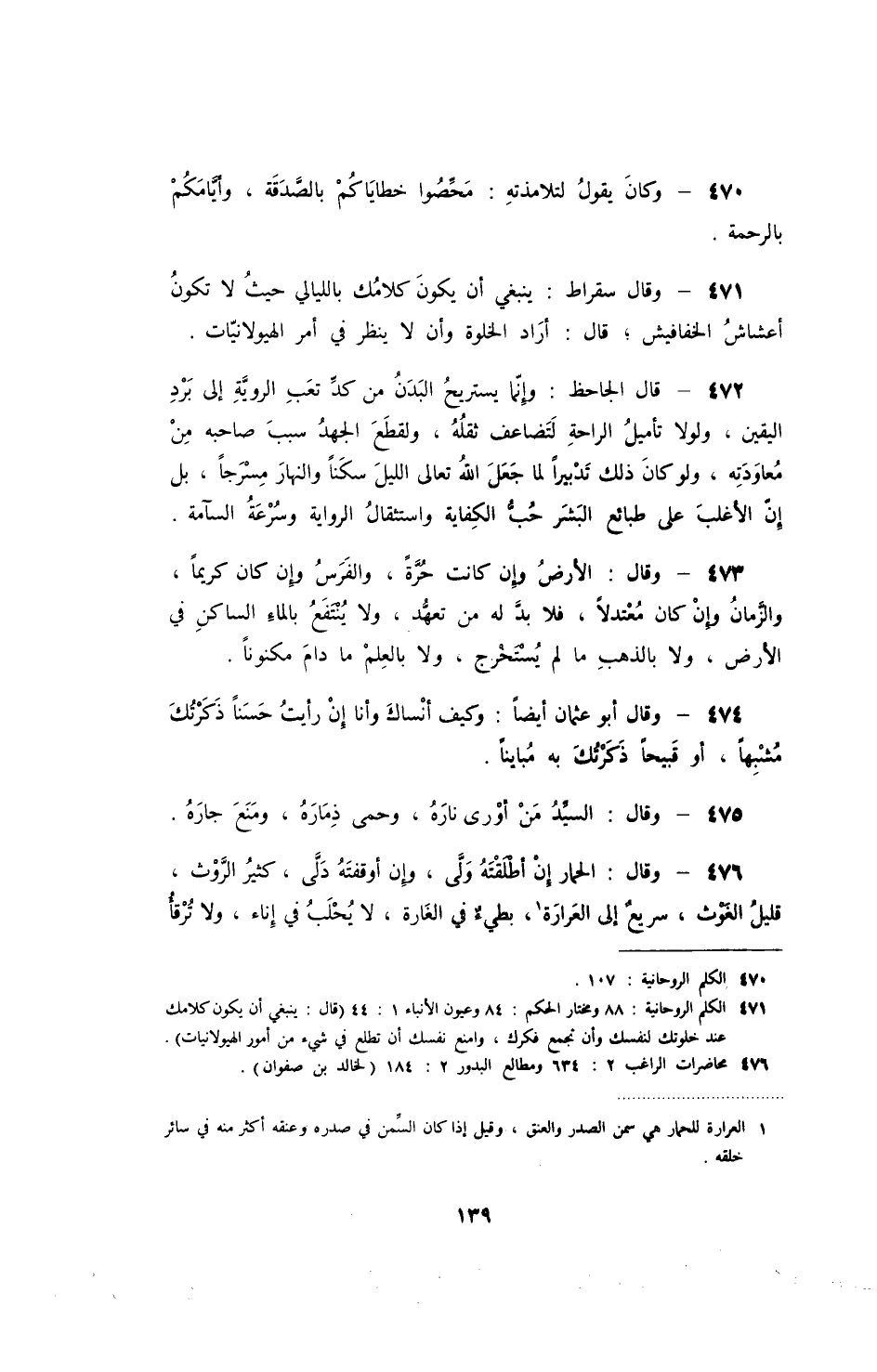 وقال سقراط: ينبغي أن يكون كلامك بالليالي حيث لا يتكون أعشاش الخفافيش؛ قال: أراد الخلوة وأن لا ينظر في أمر الهيولانيات.