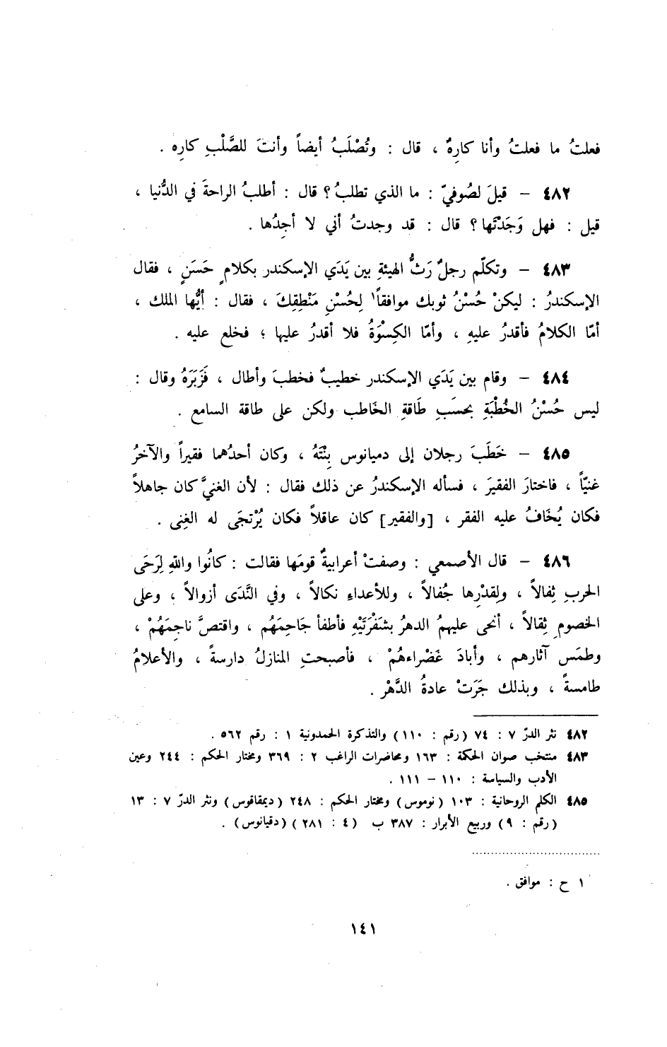 وتكلم رجل رث الهيئة بين يدي الإسكندر بكلام حسن، فقال: الإسكندر: ليكن حسن ثوبك موافقاً لحسن منطقك، فقال: أيها الملك، أما الكلام فأقدر عليه، وأما الكسوة فلا أقدر عليها؛ فخلع عليه.