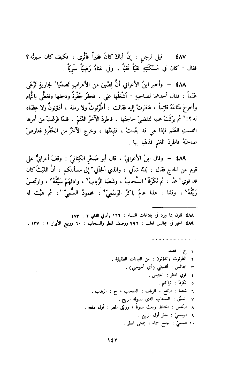 وقال ابن الأعرابي، قال أبو صخر الكناني: وقف أعرابي على قوم من الحاج فقال: بدء شأني، والذي ألجأني إلى مسألتكم، أن الغيث كان قد قوي عنا، ثم تكرفأ السحاب، وشصا الرباب، وادلهم سيقه، وارتجس ريقه، وقلنا: هذا عام باكر الوسمي، محمود السمي، ثم هبت له
