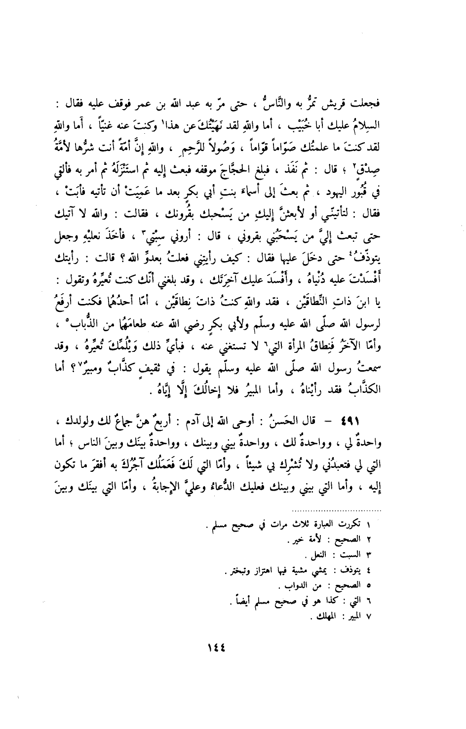 فجعلت قريش تمر به والناس، حتى مر به عبد الله بن عمر فوقف عليه فقال: السلام عليك أبا خبيب، أما والله لقد نهيتك عن هذا وكنت عنه غنياً، أما والله لقد كنت ما علمتك صواماً قواماص، وصولاً لرحم، والله إن أمة أنت شرها لأمة صدق؛ قال: ثم نفذ، فبلغ الحجاج موقفع فبعث إليه ثم استنزله ثم أمر به فألقي في قبور اليهود، ثم بعث غلى اسماء بنت أبي بكر بعد ما عميت أن تأتيه فأبت، فقال: لتأتيني أو لأبعثن إليك من يسحبك بقرونك، فقال: والله لا ىتيك حتى تبعث إلي من يسحبني بقروني، قال: أروني سبتي، فأخذ نعليه وجعل يتوذف حتى دخل عليها فقال: كيف رأيتني فعلت بعدو الله؟ قالت: رأيتك أفسدت عليه دنياه، وأفسد عليكآخرتك، وقد بلغني أنك كنت تعيره وتقول: يا ابن ذات النطاقين، فقد ولاله كنت ذات نطاقين، أما أحدهما فكنت أرفع لرسول الله صلى الله عليه وسلم ولأبي بكر رضي الله عنه طعامهما من الذباب، وأما الآخر فنطاق المرأة التي لا يستغني عنه، فبأي ذلك ويلمك تعيره، وقد سمعت رسول الله حروف يقول: في ثقيف كذاب ومبير؟ أما الكذاب فقد رأيناه، وأما المبير فلا إخالك إلا إياه.
