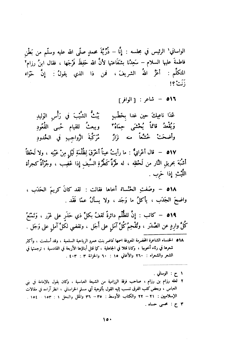 الواساني الرئيس في مجلسه: إنا - ذرية محمد حروف من بطن فاطمة عليها السلام - سعدنا بشفاعتها لأن الله حفظ فرجها، فقال ابن رزام المتكلم: أعز الله الشريف، فمن ذا الذي يقول: إن حواء زنت؟! شاعر: الوافر
