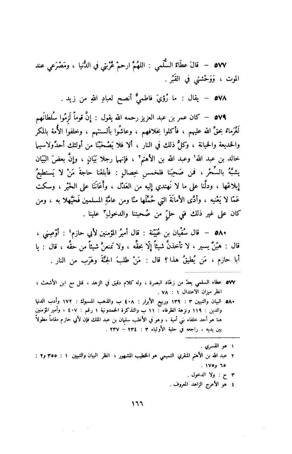 كان عمر بن عبد العزيز رحمه الله يقول: إن قوماً لزموا سلطانهم لغرماء بحق الله عليهم، فأكلوا بخلافهم، وعاشوا بأليسنتهم، وخلفوا الأمة بالمكر والخديعة والخيانة، وكل ذلك في النار، ألا فلا يصحبنا من أولئك أحد ولا سيما خالد بن عبد الله وعبد الله بن الأهتم، فإنهما رجلا بيان، وإن بعض البيان يشبه بالسحر، فمن صحبنا فلخمس خصال: فأبلغنا حاجة من لا يستطيع إبلاغها، ودلنا على ما لا نهتدي إليه من العدل، وأعاننا على الخير، وسكت عما لا يعنيه، وأدى الأمانة التي حملها منا من عامة المسلمين فحيلا به، ومن كل على غير ذلك ففي حل من صحبتنا والدخول علينا.