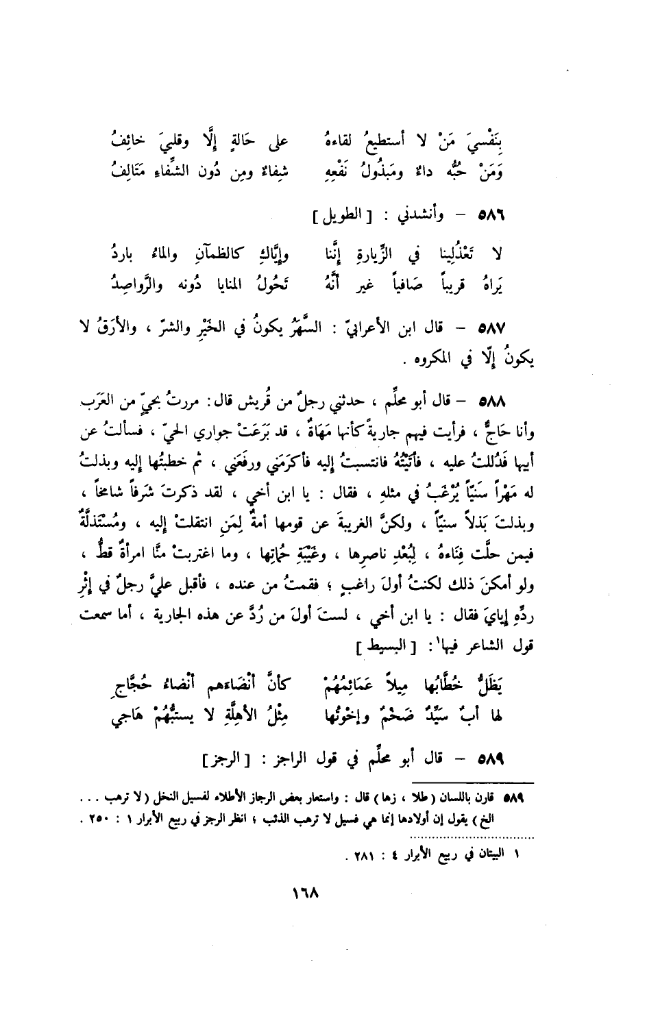 قال أبو محلم، حدثني رجل من قريش قال: مررت بحي من العرب وأنا حاج، فرأيت فيهم جارية كأنها مهاة، قد برعت جواري الحي، فسألت عن أبيها فدللت عليه، فأتيته فانتسبت إليه فأكرمني ورفعني، ثم خطبتها إليه وبذلت له مهراص سنياً يرغب في مثله، فقال: يا ابن أخي، لقد ذكرت شرفاً شامخاً، وبذلت بذلاً سنياً، ولكن الغريبة عن قومخا أمة لمن انتقلت إليه، ومستذلة فيمن حلت فناءه، لبعد ناصرها، وغيبة حماتها، وما اغتربت منا امرأة قط، ولو أمكن ذلك لكنت أول راغب؛ فقمت من عنده، فأقبل علي رجل في إثر رده إياي فقال: يا ابن أخي، لست أول من رد عن هذه الجارية، أما سمعت قول الشاعر فيها: البسيط