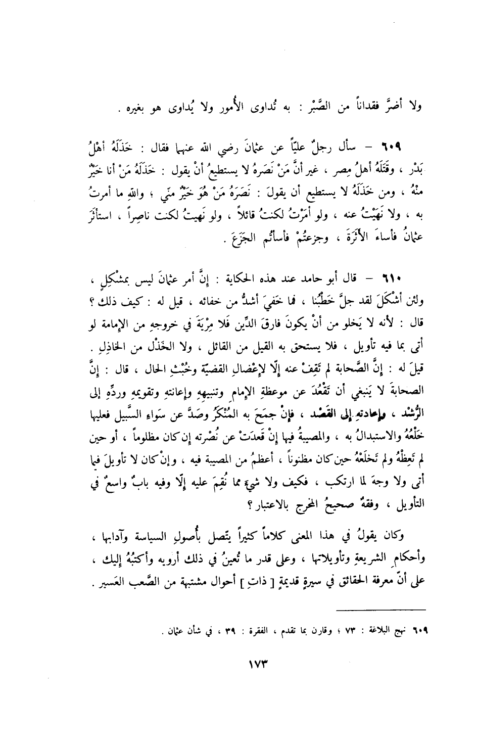سألرجل علياً عن عثمان رضي الله عنهما فقال: خذله أهل بدر، وقتله أهل مصر، غير أن من نصره لا يستطيع أن يقول: خذله من أنا خير منه، ومن خذله لا يستطيع أن يقول: نصره من هو خير مني؛ والله ما أمرت به، ولا نهيت عنه، ولو أمرت لكنت قائلاً، ولو نهيت لكنت نصراً، واستأثر عثمان فأساء الأثرة، وجزعتم فأسأتم الجزع.