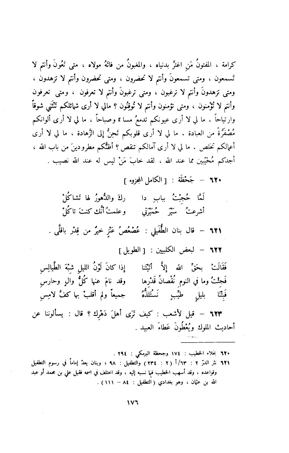 كرامة، المفتون من اغتر بدنياه، والمغبون من فاته مولاه، متى تعون وأنتم لا تسمعون، ومتى تسمعون لا تحضرون، ومتى تحضرون وأنتم لا تزهدون، ومتى تزهدون وأنتم لا ترغبون، ومتى ترغبون وأنتم لا تعرفون، ومتى تعروفن وأنتم لا تؤمنون، ومتى تؤمنون وأنتم لا توقنون؟ مالي لا أرى شمائلكم تنثني شوقاً وارتياحاً، ما لي لا أرى عيونكم تدمع مساء وصباحاً، ما لي لا أرى ألوانكم مصفرة من البعادة، ما لي لا أرى قلوبكم تحن إلى الزهادة، ما لي لا أرى أعمالكم تخلص، ما لي لا أرى قلوبكم تحن إلى الزهادة، ما لي لا أرى أعمالكم تخلص، ما لي لا أرى آمالكم تنقص؟ أظنكم مطرودين من باب الله، أجدكم مخيبيب مما عند الله، لقد خاب من ليس له عند الله نصيب.