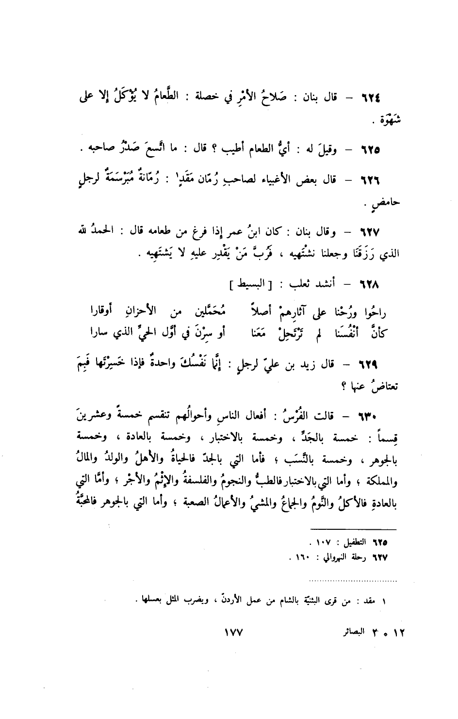 قال زيد بن علي لرجل: إنما نفسك واحدة فإذا خسرتها فبم تعتاض عنها؟ قالت الفرس: أفعال الناس وأحوالهم تنقسم خمسة وعشرين قسماً: خمسة بالجد، وخمسة بالختيار، وخمسة بالعادة، وخمسة بالجوهر، وخمسة بالنسب؛ فاما التي بالجد فالحياة والأهل والولد والمال والمملكة؛ وأما التي بالاختيار فالطب والنجوم والفلسفة وافثم والأجر؛ وأما التي بالعادة فالأكل والنوم ولاجماع والمشي والأعمال الصعبة؛ وأما التي بالجوهر فالمحبة